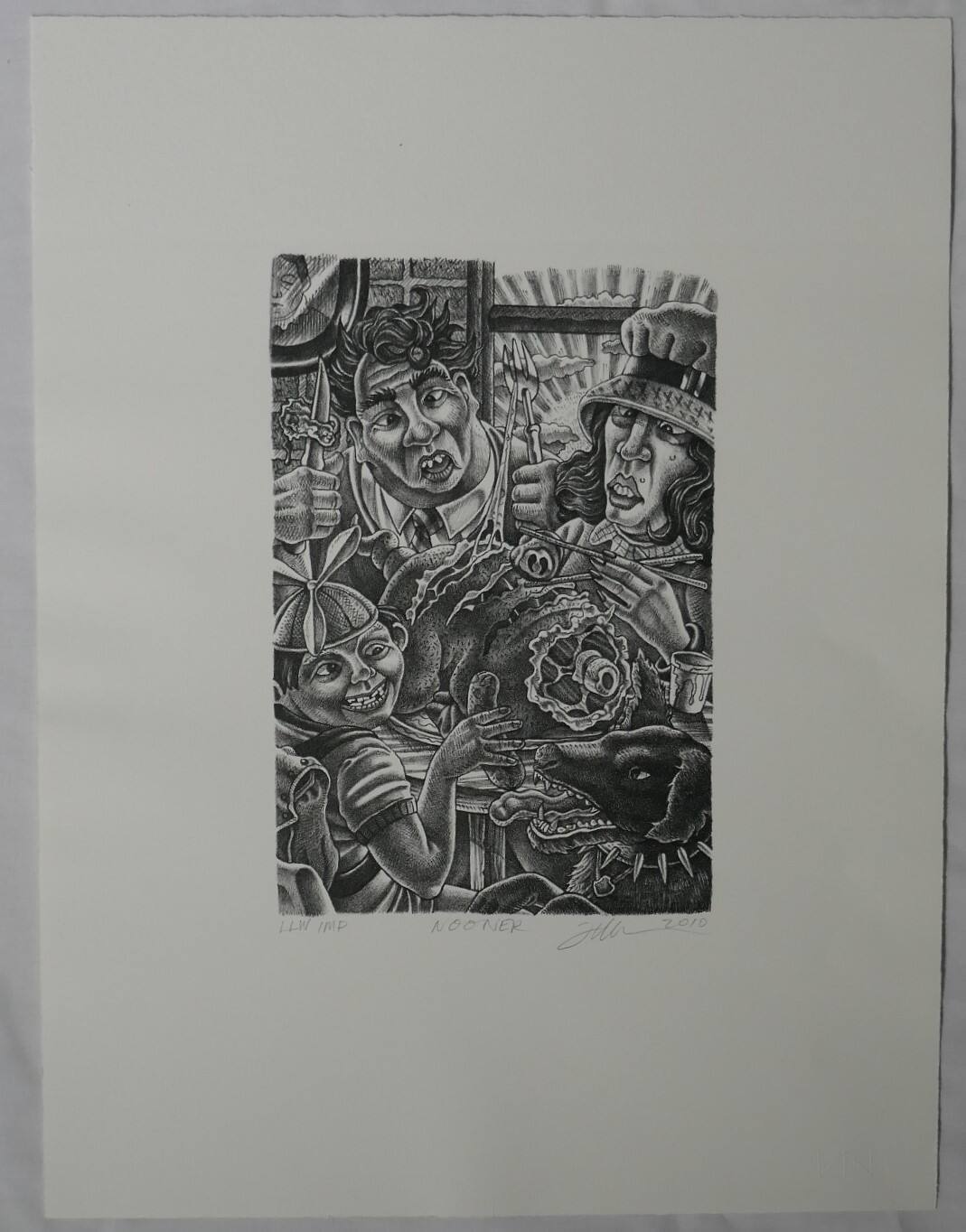 DescriptionBlack and white. Family seated around a bone-in ham at the lunch table: man, with thick wavy black hair and a furrowed brow, upper left, holding a carving knife in his proper right hand and a three-pronged carving fork in his proper left hand. Woman wearing a hat, upper right, holds chopsticks in her proper left hand. A cup is next to her hand. Boy, lower left, wears a beanie with a rotating propeller. He feeds a sausage to a dog, lower right, to a dog with its mouth open displaying its teeth and an eager tongue. The dog wears a spiked collar. Through the window in the background, a bright sun and rays.Provenance
