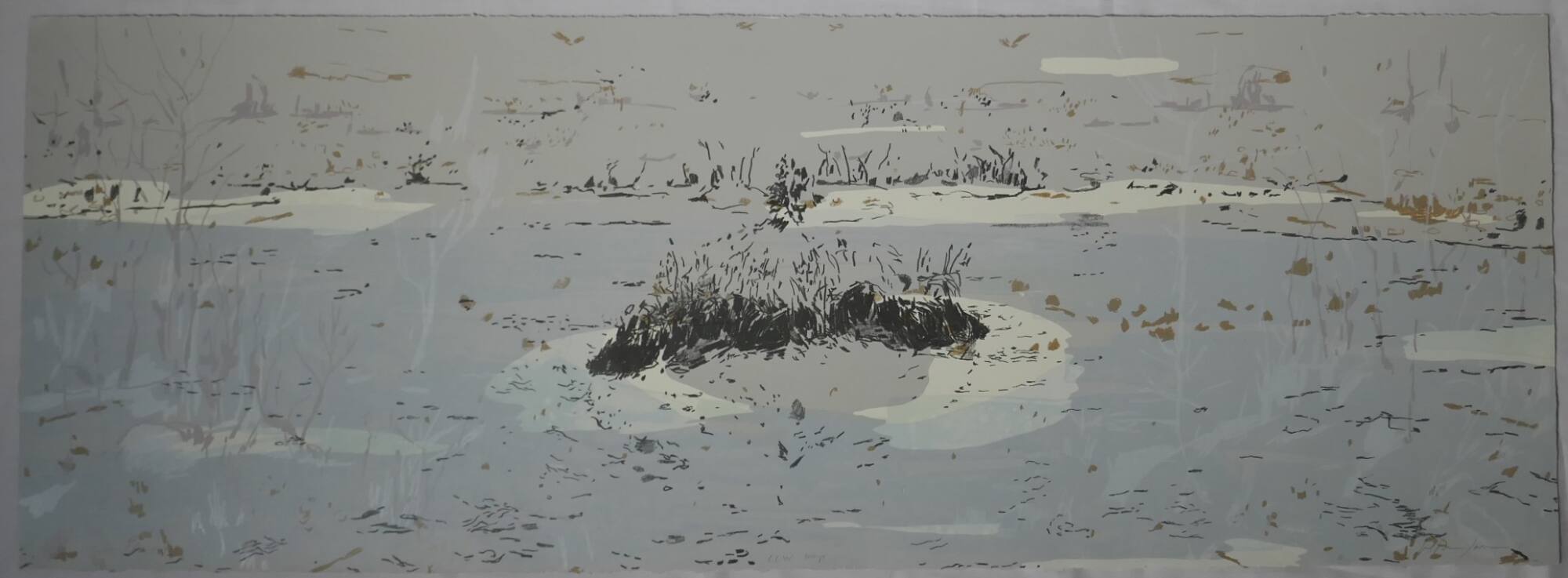 DescriptionHorizontal format. Image in grey, pale blue, brown and white of a section of a pond with individual weeds and tufts of weeds poking out of the water. In the center, a string of tufts embraced left and right with curves of white pond scum. Other long patches of white pond scum at upper left and upper right.Provenance
