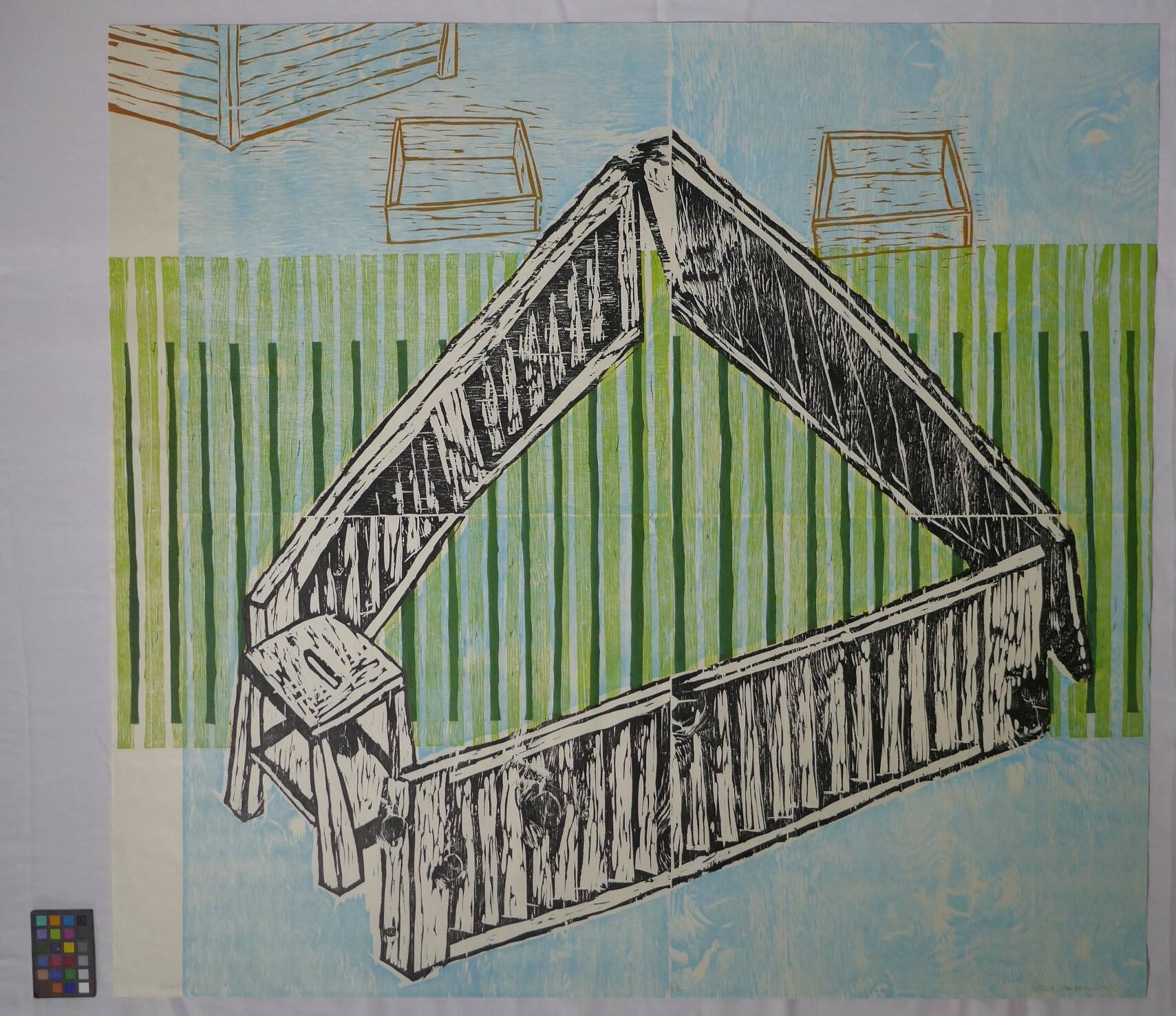 DescriptionTrapezoidal wooden fort in center of image. Short side on left is a wooden stool. Side on right leans against the other two sides rather than being attached to them. Background is patchy light blue. Middle background behind fort is green boards with black stripes over a pattern with yellow boards. Three sketches for a fort at the top: partial in upper left corner, whole sketches left and right of center.ProvenanceC. Richard Belger and Evelyn Craft Belger, Kansas City, MO;