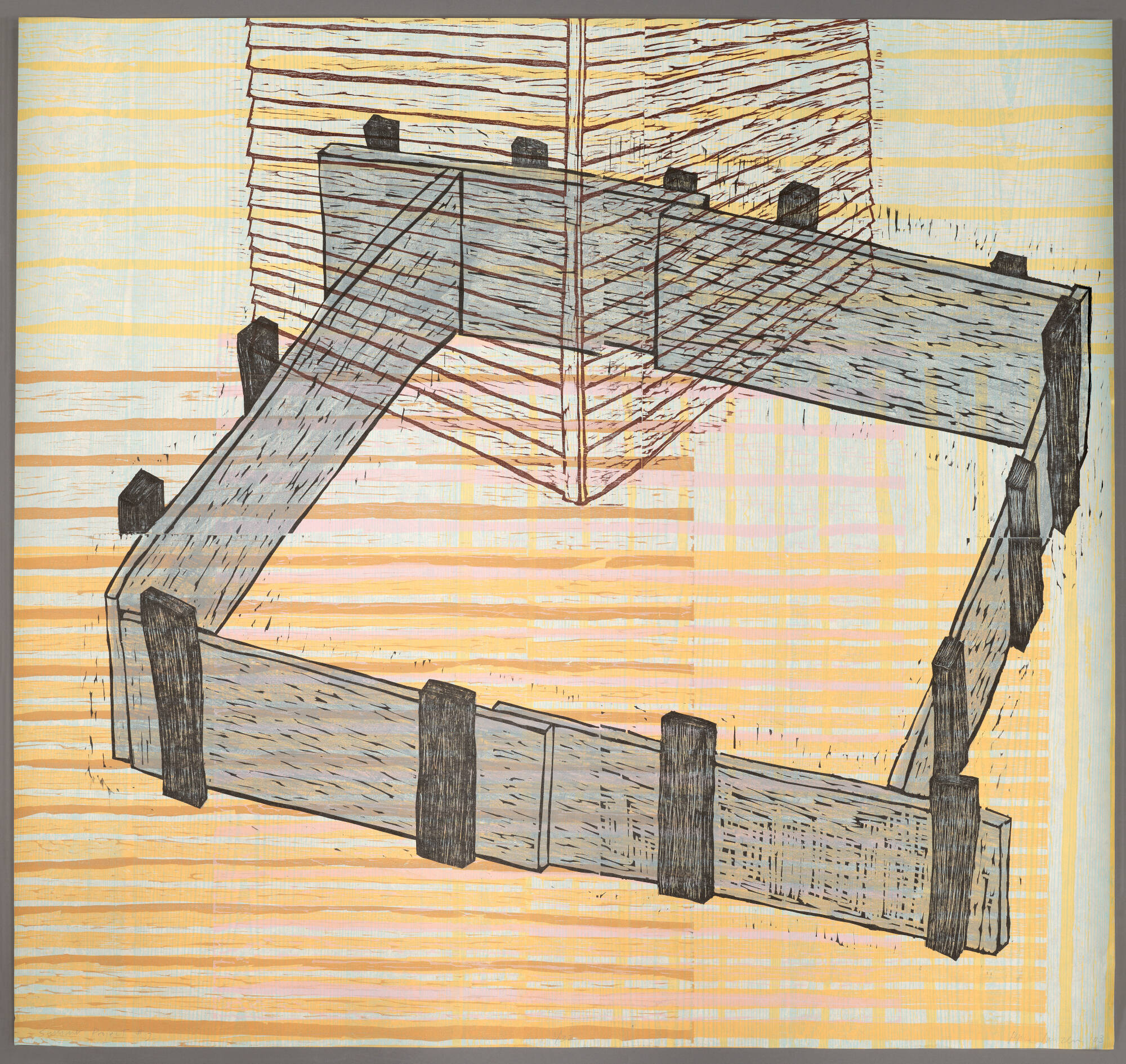 DescriptionDesign for grey wood rectangular fort with brown upright supports. Front side projects out of the rectangle at lower right; back side projects out from the rectangle at upper left. Pale sketch for a fort corner superimposed in center of upper half. Background is pale yellow and orange horizontal stripes in lower left quarter; orange and pale blue horizontal stripes in upper left quarter; pale blue horizontal and vertical stripes in upper right quarter; pale yellow with faint blue vertical stripes in lower right corner.Provenance