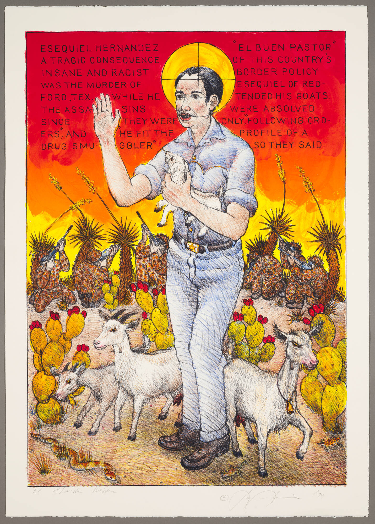 InscribedThe upper half of the image is red with writing: ESEQUIEL HERNANDEZ, EL BUEN PASTOR. AA TRAGIC CONSEQUENCE OF THIS COUNTRY’S INSANE AND RACIST BORDER POLICY WAS THE MURDER OF ESEQUIEL OF REDFORD, TEX. WHILE HE TENDED HIS GOATS. THE ASSASSINS WERE ABSOLVED SINCE THEY WERE ‘ONLY FOLLOWING ORDERS’ AND HE FIT THE PROFILE OF A DRUG SMUGGLER, SO THEY SAID.