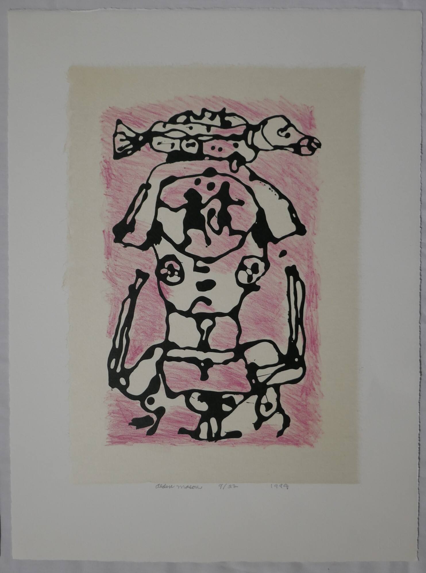 DescriptionThe upper torso of a black and white figure with raised arms against a rubbed pink background. Possibly female: a breast appears next to proper right arm. On her forehead is a medallion with two dancing figures in black. On top of her head she wears a cloth or hat with a salmon on it facing right.Provenance
