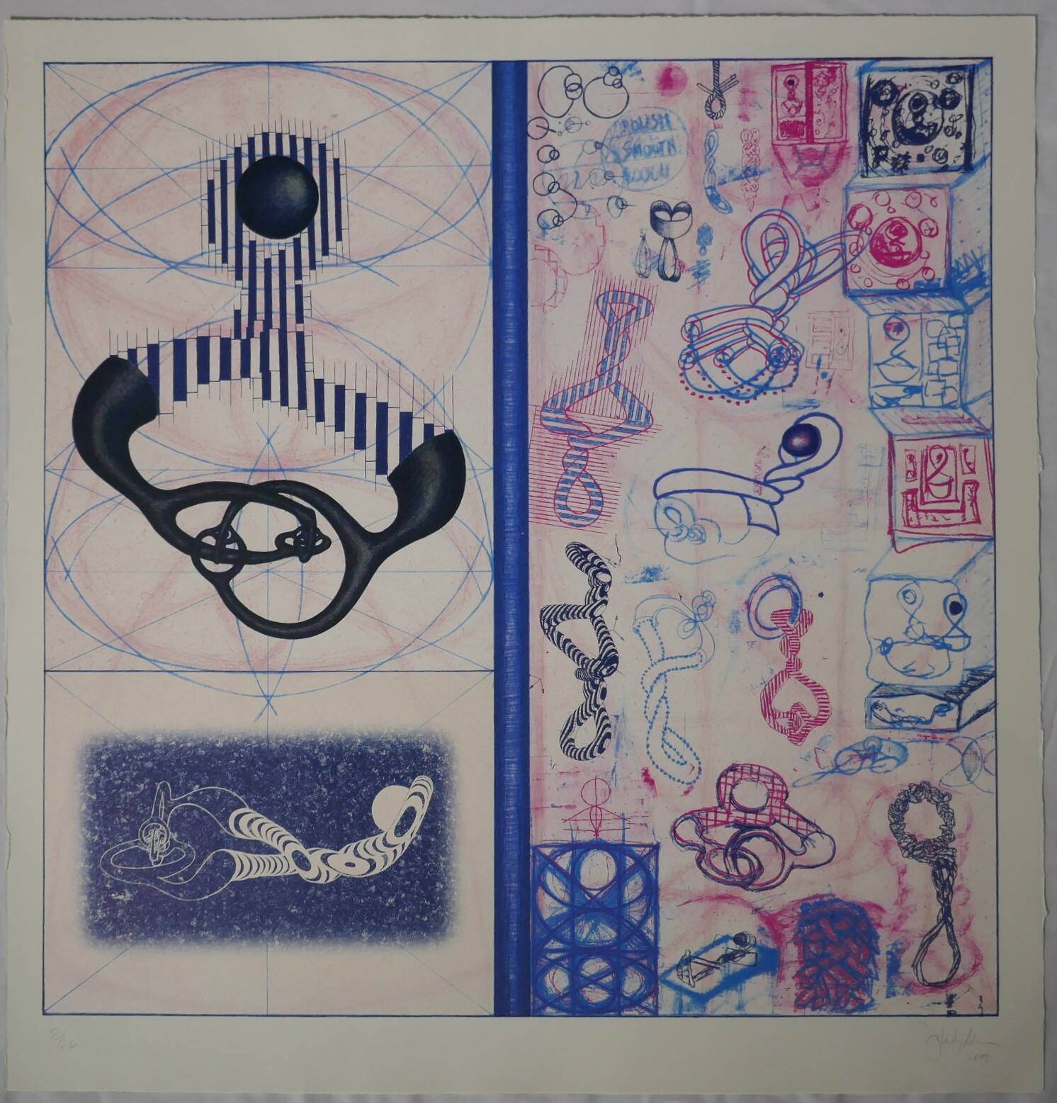 DescriptionImage in navy blue, pink and white, no black, against a pale taupe background. The left half is split into two sections. The shape in the large upper left suggests part of a human torso: a navy ball surrounded by blue vertical stripes that converge into a neck and diverge again into two arms that end in solid blue forearms coming forward, with linked circles instead of hands. In the background, thin blue arcs and patches of pale pink. In the lower left section. A similar figure lying on its side, mostly white against a background of speckled blue. In contrast to the upper figure, the stripes of the arms are curved for a three-dimensional effect. On the right half of the print, variants on these shapes in pink and blue, with a stack of pink and blue boxes on the upper right.ProvenanceC. Richard Belger and Evelyn Craft Belger, Kansas City, MO;