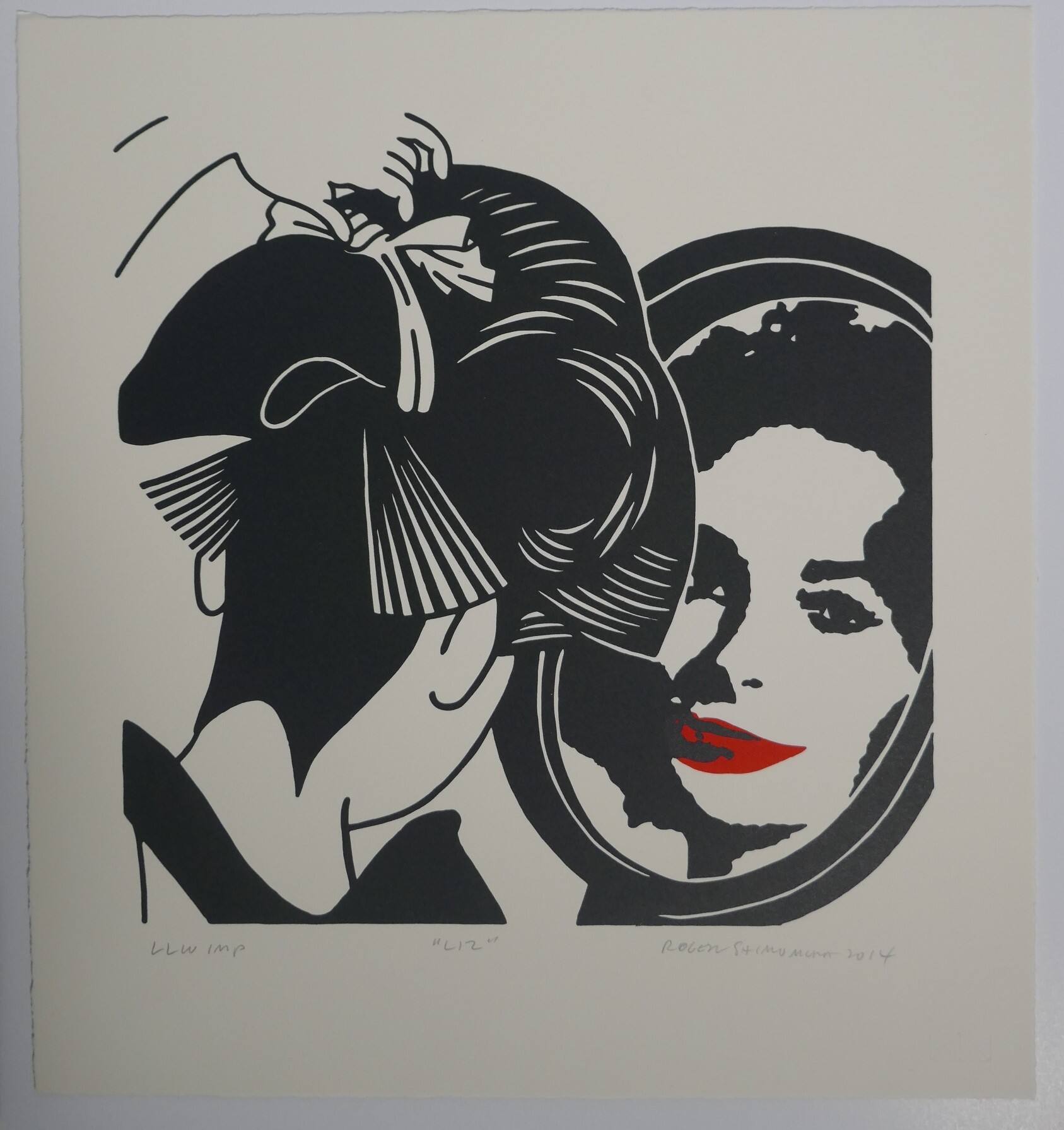 DescriptionFrom the left: a Kabuki actress in an elaborate black wig gazes into an oval mirror with a black frame, but instead of her reflection, the mirror shows Andy Warhol’s Elizabeth Taylor with bright red lipstick. The actress’s proper left hand reaches up to adjust a knotted ribbon in her hair.ProvenanceC. Richard Belger and Evelyn Craft Belger, Kansas City, MO;
