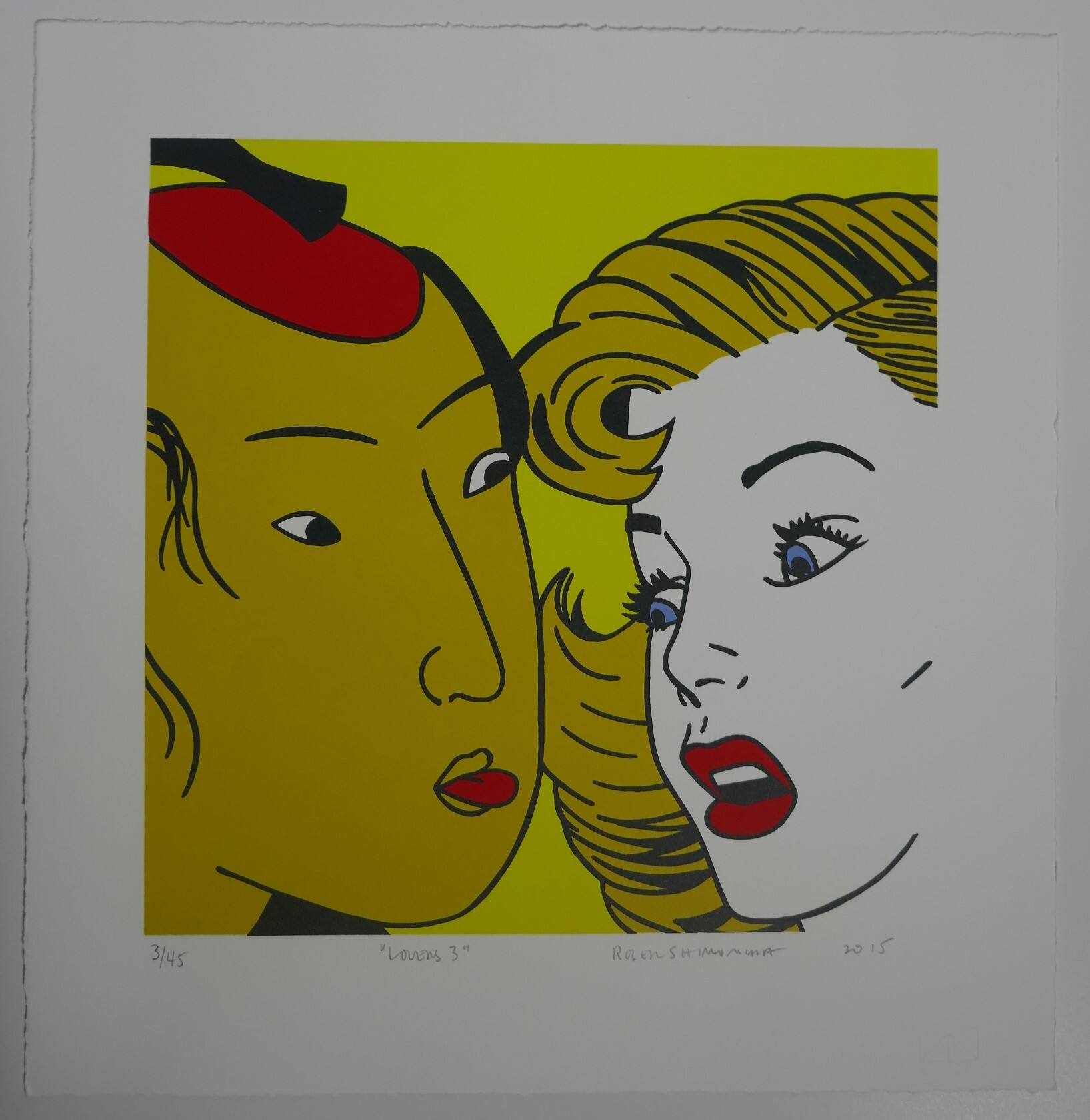 DescriptionAgainst a bright yellow background, two heads. A Japanese man on the left, facing right. He has pale yellow skin, a red cap, and black hair. He sticks out his red tongue at a Caucasian woman with blonde hair on the right, facing left. She has a shocked expression on her face, her blue eyes opened wide and her red lips parted, revealing white teeth.ProvenanceC. Richard Belger and Evelyn Craft Belger, Kansas City, MO;