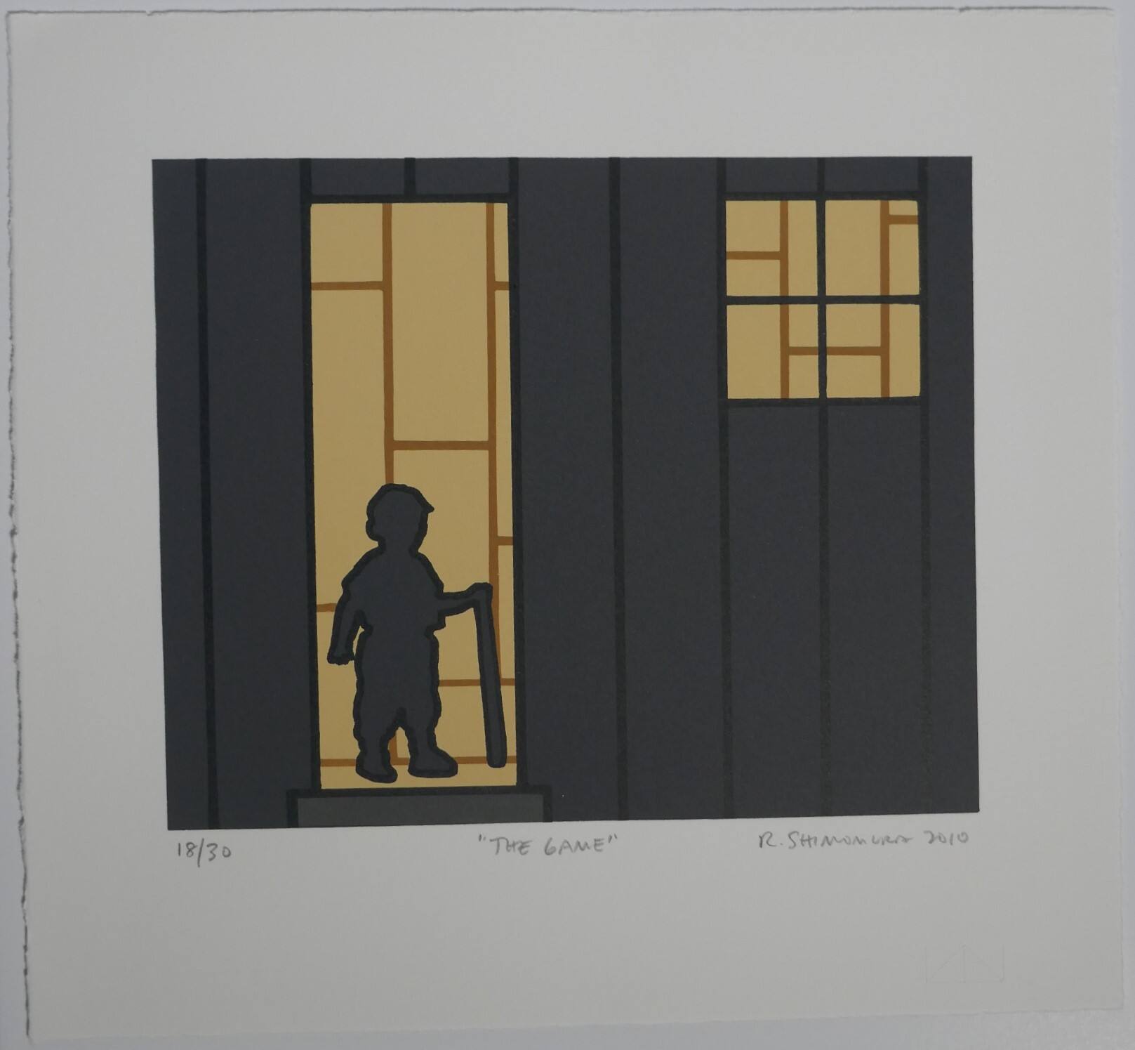 DescriptionThe side of a house, seven brown boards. Through an open doorway on the left and a cross-barred window on the upper right, either a beige Japanese screen held together by brown slats (? Dowels?) or a series of shorter vertical boards making up the wall of the house. A sturdy little boy stands in the doorway with his feet apart, turned slightly to the right. He wears a baseball cap and his proper left hand rests on an upright baseball bat.ProvenanceC. Richard Belger and Evelyn Craft Belger, Kansas City, MO;