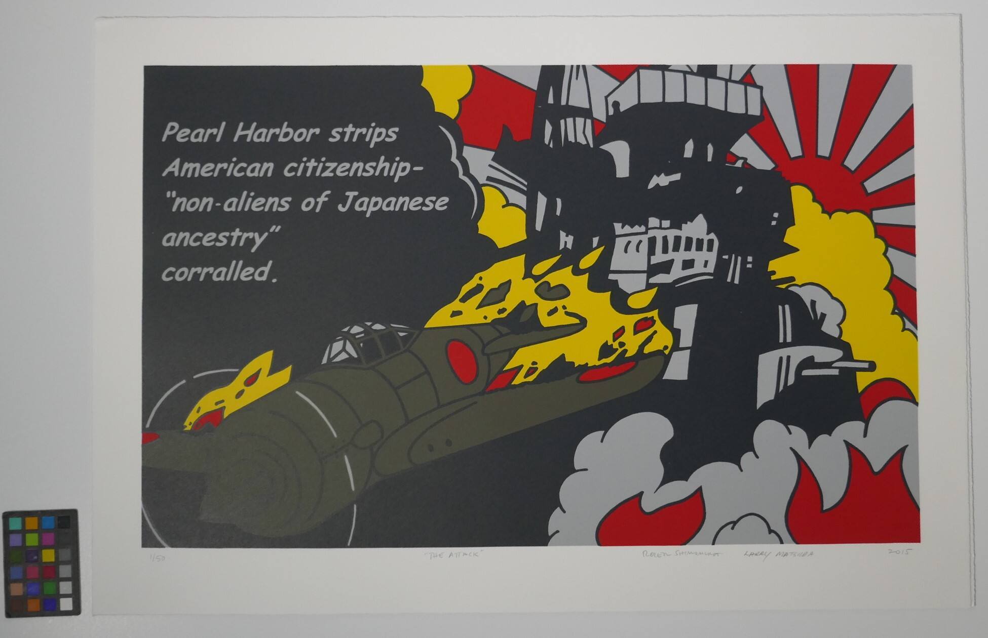 DescriptionHorizontal format. Written in pale grey against a black background on the upper left: "Pearl Harbor strips American citizenship – “non-aliens of Japanese ancestry” corralled." Below it, a brown bomb spurting yellow and red flames moves diagonally from the center to the lower left. In the right half, a section of a grey and black battleship surrounded by yellow and red flames and grey smoke. In the background at upper right, a red sun emitting red rays.ProvenanceC. Richard Belger and Evelyn Craft Belger, Kansas City, MO;