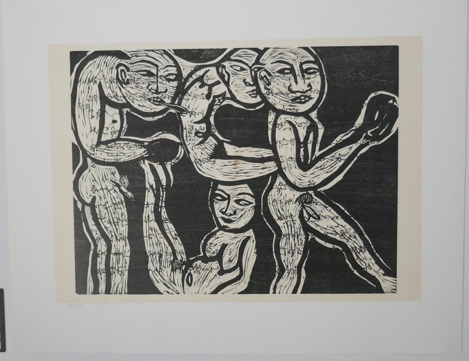 DescriptionBlack and white print of four nude figures whose body postures spell out F, U, C, K. From the left, a man with his head bent forward to the right to fit within the frame of the print and his proper right forearm bent at a 90-degree angle. He holds the feet of a woman lying on her elbows, extending her legs up to the left, her body forming a U shape. She appears to look out at the viewer. Above her, a man facing right curving his body into a C. Part of his face is cut off by the head of the K figure, who stands on his proper right leg and extends his proper left leg forward; his proper right forearm arm is bent upward at a 45-degree angle. He looks out at the viewer.ProvenanceC. Richard Belger and Evelyn Craft Belger, Kansas City, MO;