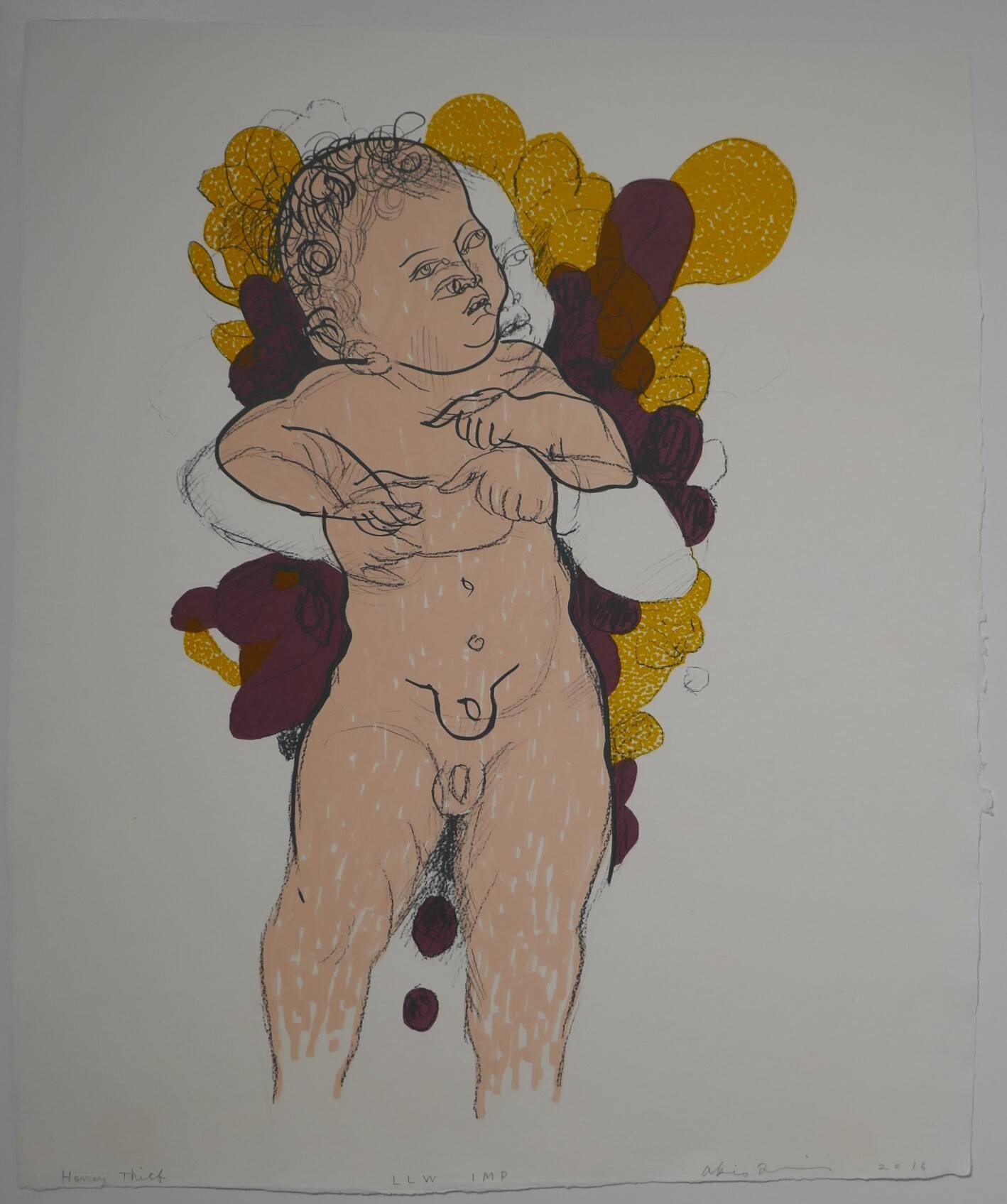 DescriptionImage of two male babies standing upright, a flesh-colored one superimposed on a white one. They stand in the same posture but don’t line up, so that the flesh-colored baby appears to have four hands and two penises. His legs are cut off at mid-calf. Irregular reddish-brown and yellow shapes behind the figures. Dots of brown between the legs suggest feces.ProvenanceC. Richard Belger and Evelyn Craft Belger, Kansas City, MO;