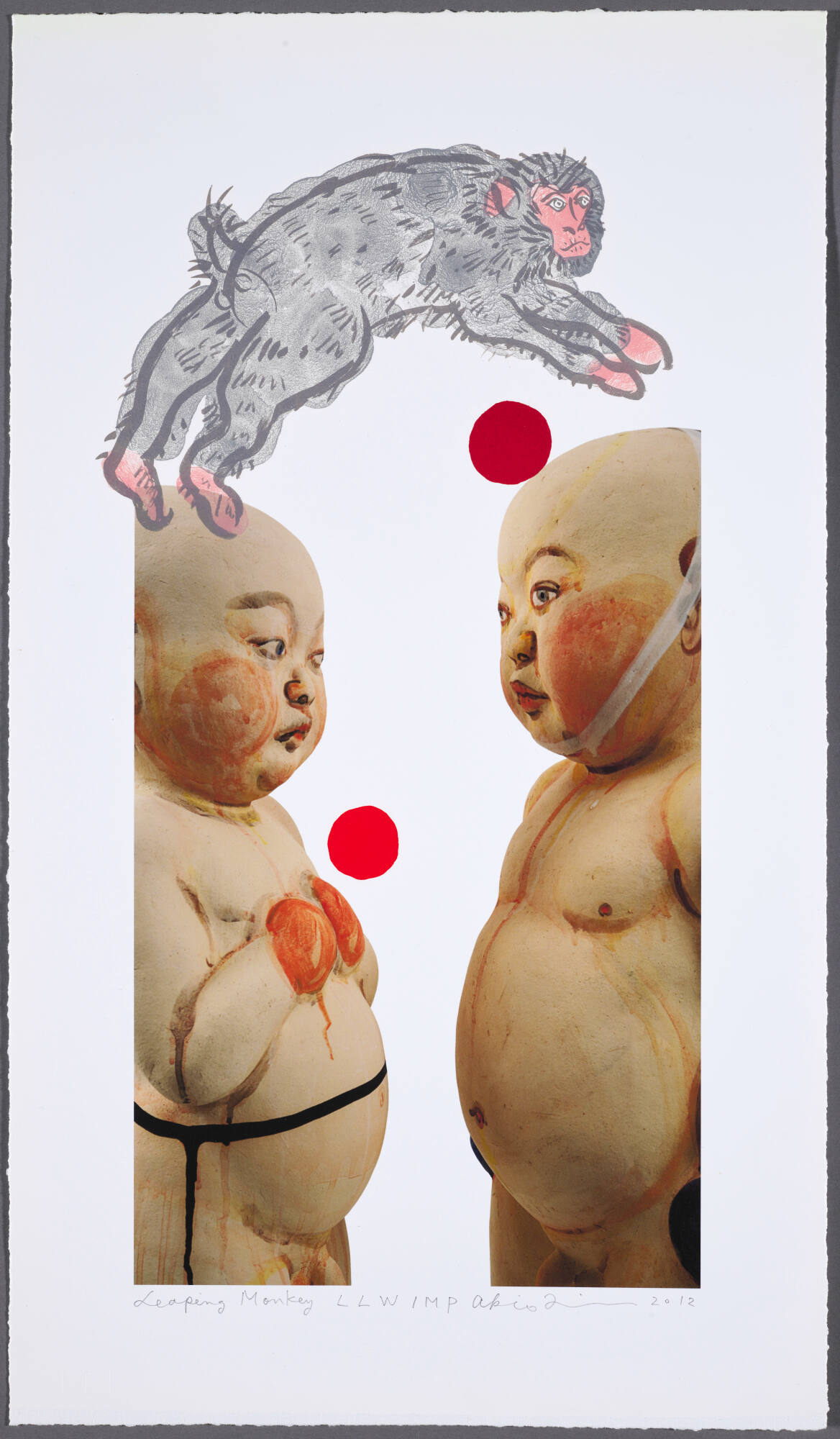 DescriptionTwo bald, pot-bellied ceramic boys face each other while a grey monkey leaps over their heads. The boy on the left, facing right, has red circles on his cheeks and rudimentary red hands clutched to his chest. A black line across his stomach and down his proper right side suggests a belt or trousers, although his penis is visible. A red circle hovers over his hands. A darker red circle hovers over his forehead. The boy on the right, facing left, wears a pale chin strap visible across his proper left cheek but is otherwise nude. The leaping monkey is not ceramic but a drawing. It has pale grey fur with darker grey patches and a pink face, hands and feet.ProvenanceC. Richard Belger and Evelyn Craft Belger, Kansas City, MO;
