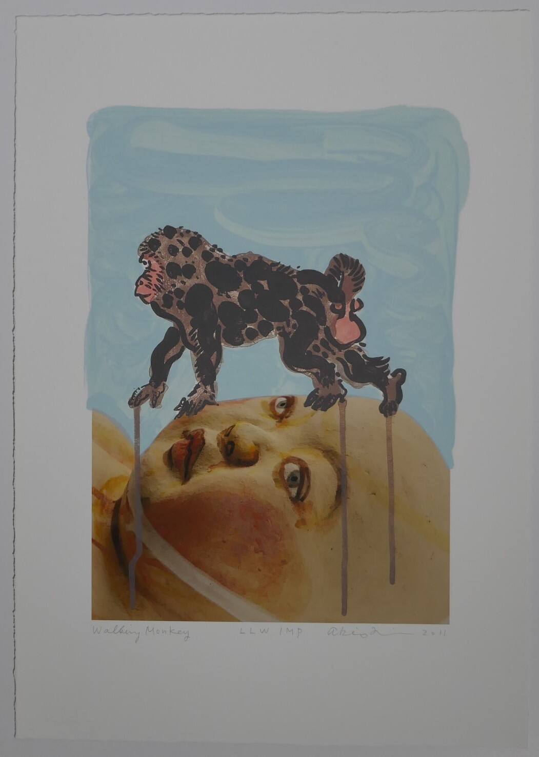 DescriptionCeramic head of a boy lying down. The top of his head is at the right edge of the print and his face is seen in three-quarter view, looking up with open eyes. His cheeks and lips are red and he wears a pale chin strap. A grey monkey with darker grey patches on its fur and pink face and hindquarters, shown mostly in profile, walks across the face from right to left. Thin lines of grey paint drip from the monkey’s proper right front paw and both back paws. Streaky light blue background.ProvenanceC. Richard Belger and Evelyn Craft Belger, Kansas City, MO;
