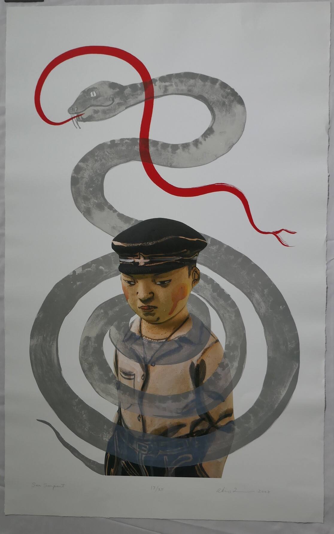 DescriptionA ceramic figure of a young man, seen from the hips up, occupies the center of the lower half of the print. He wears a black cap with a gold insignia above the center of the brim, a tan shirt, and black trousers. He has a line of facial hair under his lower lip and on his chin. A grey serpent swirls in concentric circles once around his neck and twice around his body. The serpent’s head and the rest of its body form a reverse-S shape above the man’s head. The snake faces left in profile with a long, red, forked, wavy tongue that goes from upper left to middle right. The serpent’s tail is seen next to the figure’s proper right hip.ProvenanceC. Richard Belger and Evelyn Craft Belger, Kansas City, MO;