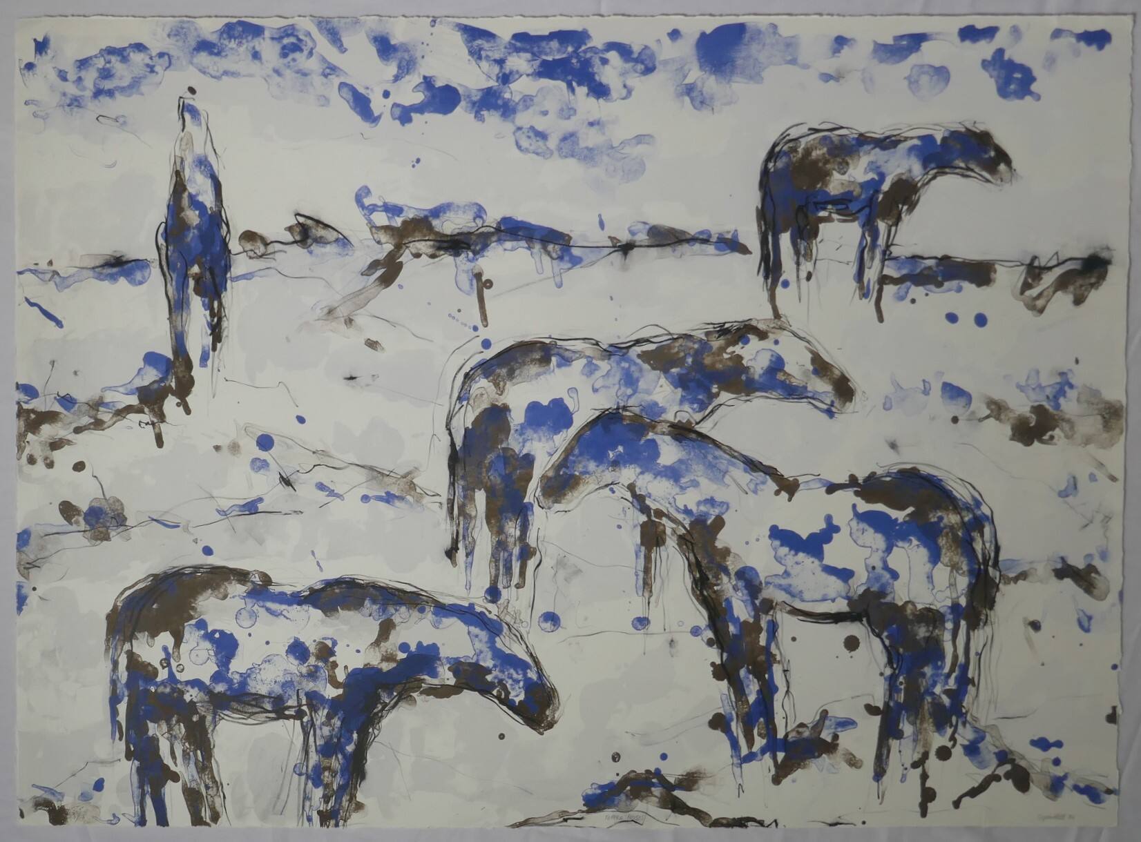 DescriptionFive horses sketchily outlined in black stand in a field. The horses are the same color as the field and, like it, are spattered in blue. The poses of the horses: Upper left, seen head-on or tail-on (hard to tell). Lower left, in profile facing right. Lower right, in profile facing left. Center, in profile facing right. Upper right, in profile facing right.ProvenanceC. Richard Belger and Evelyn Craft Belger, Kansas City, MO;