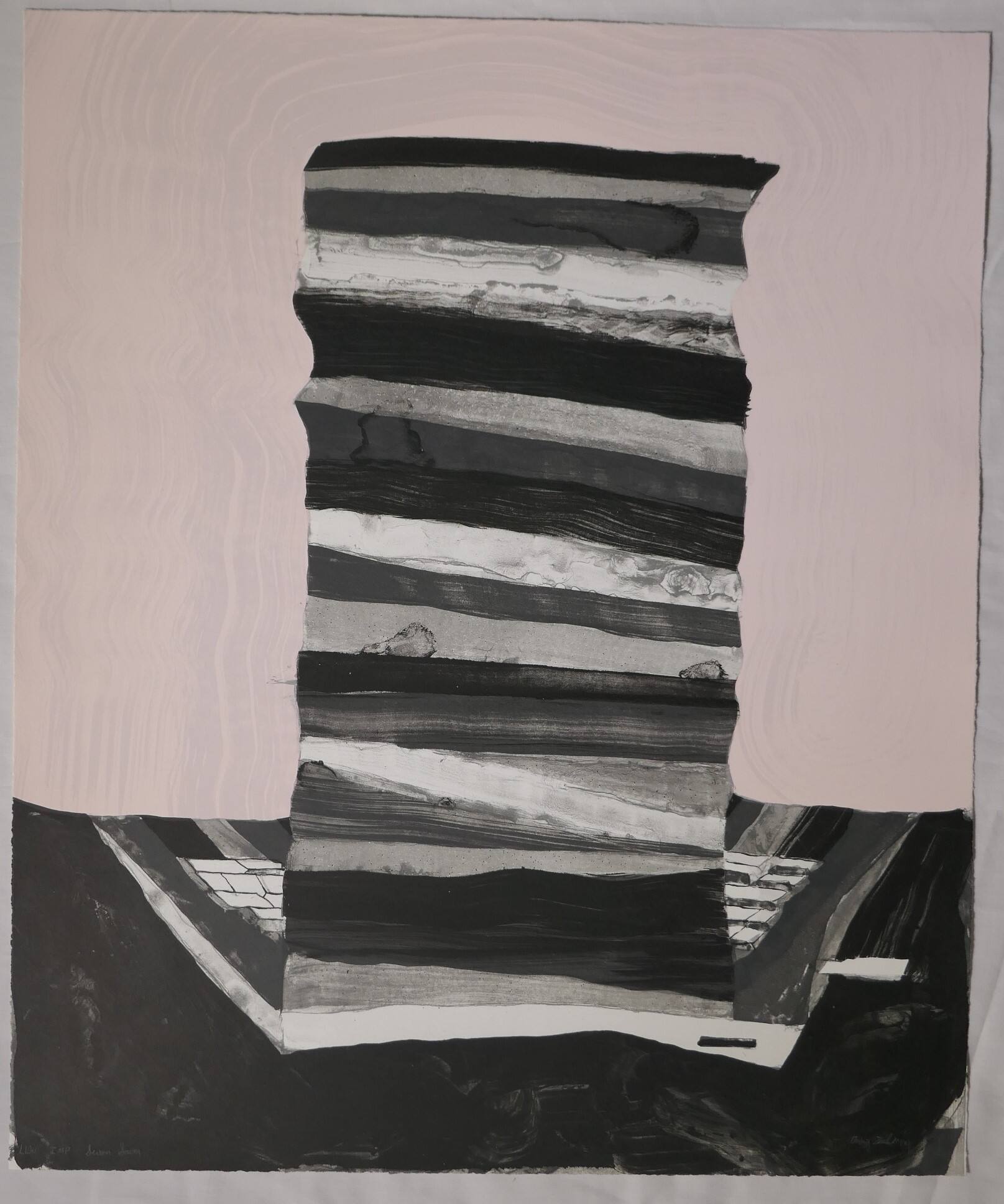 DescriptionLaptop with raised lid seen from the back, against a pale lavender background. Portions of the keyboard resting on a streaky black desk can be seen on either side of the lid. The lid is much taller than in real life, with horizonal stripes in shades of black, white and grey slanting slightly from left to right.Exhibition HistoryThe Lawrence Lithography Workshop: Highlights from the Archive. The Nelson-Atkins Museum of Art, Kansas City, MO. December 21, 2024 - June 22, 2025.