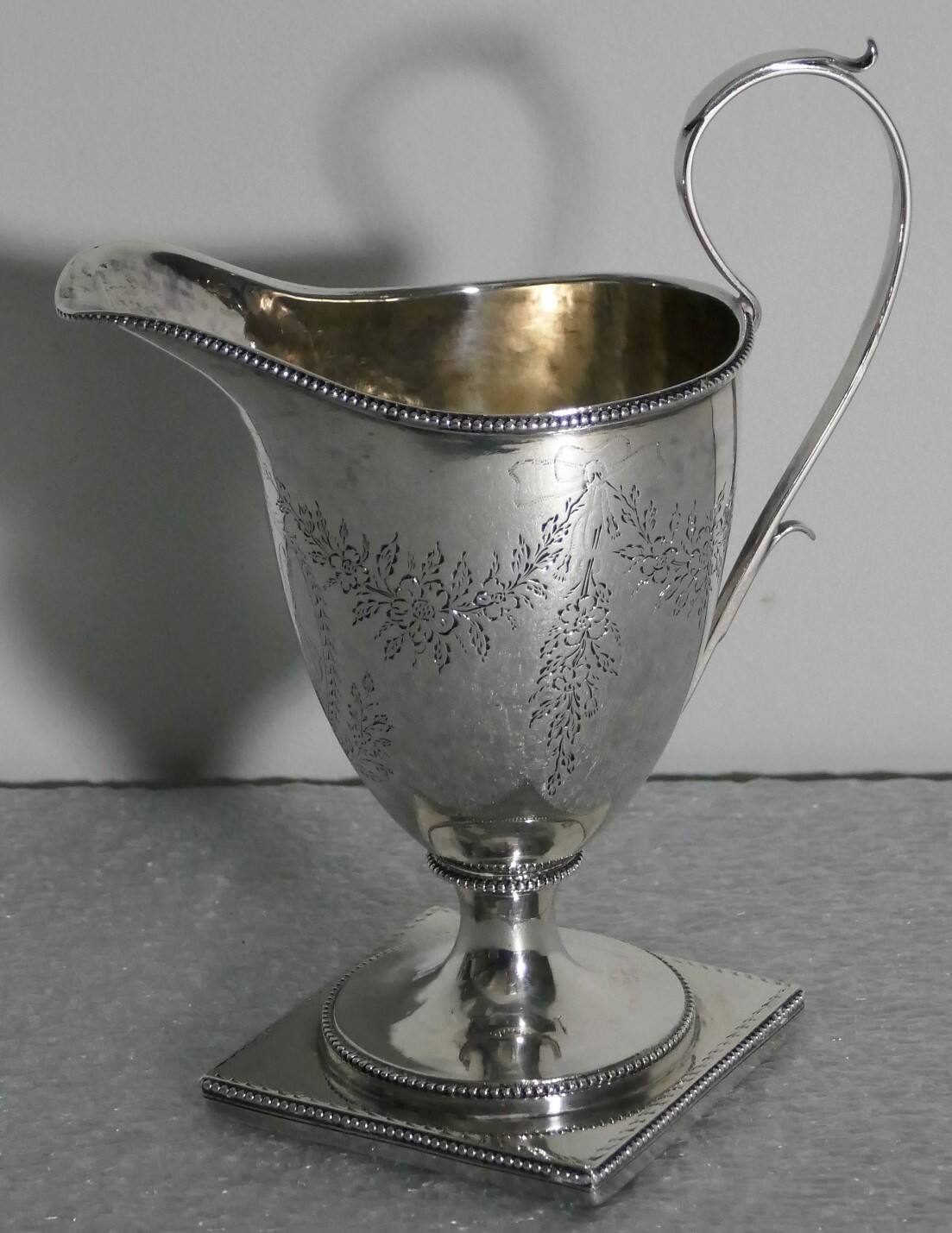 DescriptionSterling silver tea service comprising a galleried teapot, a galleried covered sugar bowl, a creamer and a waste bowl, all with bright-cut engraved floral wreaths and square plinth bases.Published ReferencesOn Dubois in general: