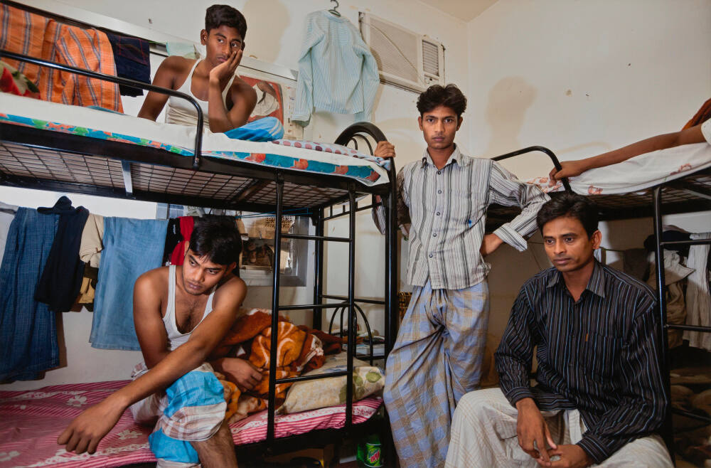 Electrician Syed (center) and plumbers (from top left) Ujal, Abdul, and Shah, at the Sonapur labor camp, Dubai