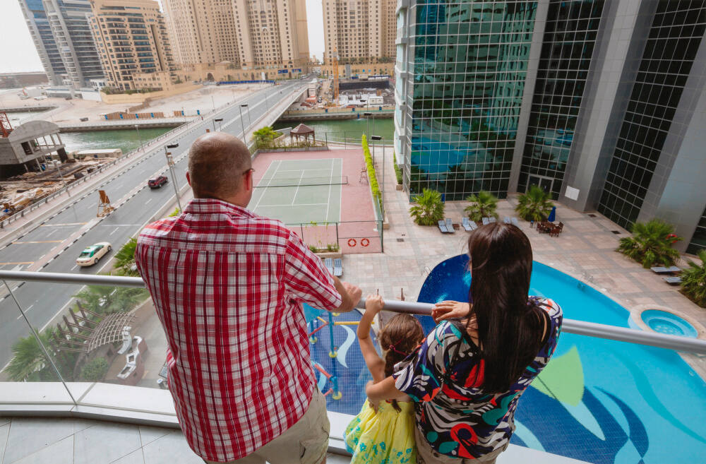 Steve and Natalie, expats from South Africa, on their apartment's balcony, Dubai