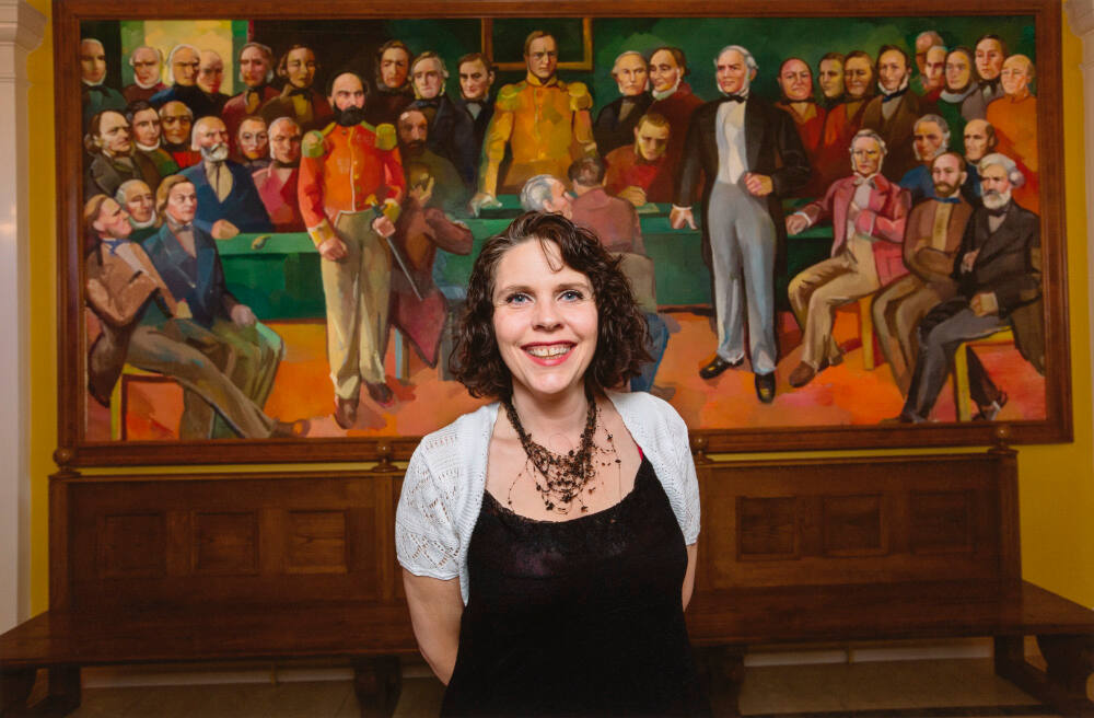 Birgitta Jónsdóttir, 45, a member of Iceland's parliament, with a mural depicting its historically all-male ranks, Reykjavík