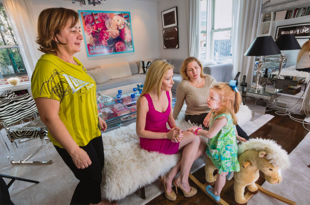 Suzanne, 48, with her daughter, Sydney, 3, Brazilian nanny Alice (left), 53, and Jennifer, 40, the surrogate who gave birth to Sydney, at Suzanne's apartment, New York City