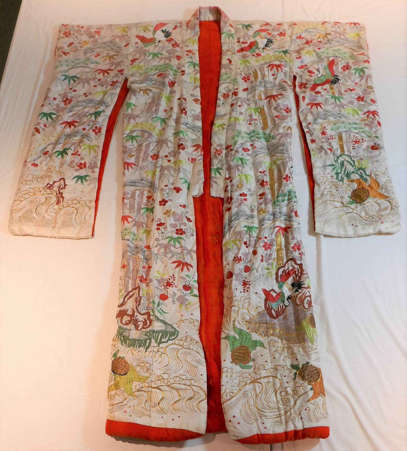 DescriptionThis is an outer garment with long, swinging sleeves (furisode) tailored for a bride's maid. The ground fabric is figured silk satin (rinzu) with woven motifs, including swastika and chrysanthemum. The surface is filled with embroidered, stenciled, and hand-drawn motifs such as crane, minogame tortoise, Mount Hōrai, bamboo, pine, plum, orange, and wave. The robe is lined with orange-red colored silk fabric, and felted silk fills between the surface textile and the lining.