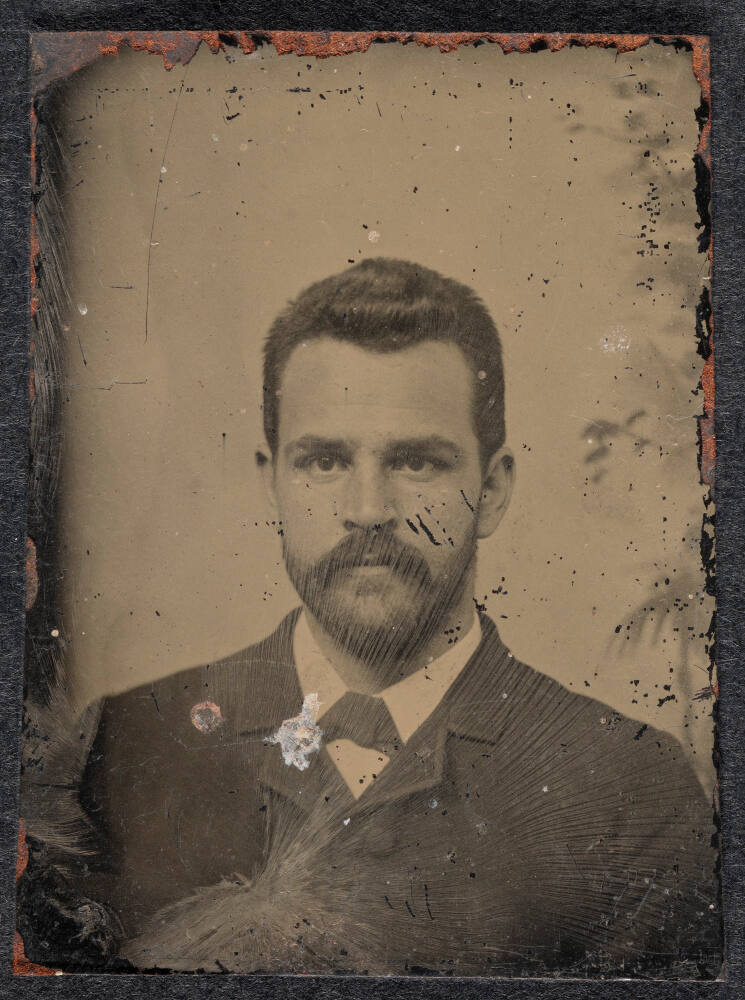 This tiny gem tintype portrait depicts George Wells Fitz (1860–1934), the fourth son of Henry and Julia (Wells) Fitz. George Fitz attended Harvard Medical School and was a strong advocate for the physical benefits of exercise and hygiene. In 1891, he founded the Department of Anatomy, Physiology, and Physical Training at Harvard University, leaving in 1899 to enter private practice. Gem tintypes, produced inexpensively and at a small scale, were often mounted on jewelry or presented in family albums.
