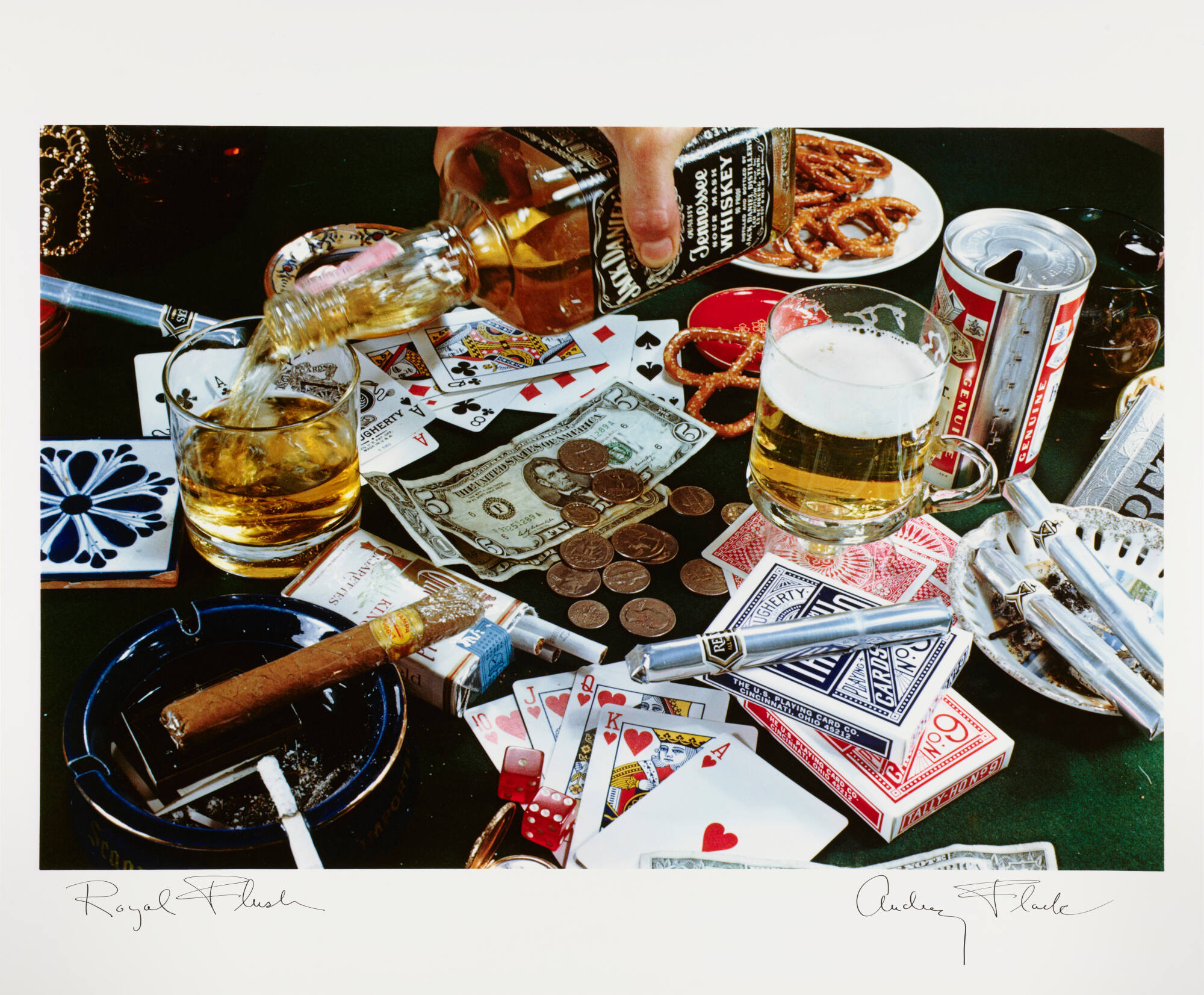 DescriptionStill life image of a green felt table top with playing cards, cigars, and pretzels. A small pile of bills and coins are in the center of the table and a hand is pouring a glass of Jack Daniel's Tennessee Whisky into a clear glass.Copyright© Audrey Flack