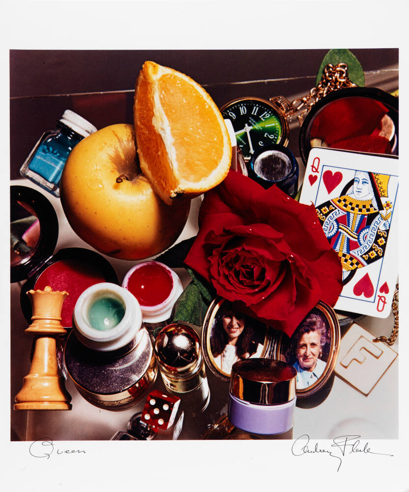 DescriptionStill life image composed of an apple, orange slice, pocket watch, Queen of Hearts playing card, red rose, locket with a photograph of a young woman and an older woman, lip-gloss, and a chess piece among other items.Copyright© Audrey Flack
