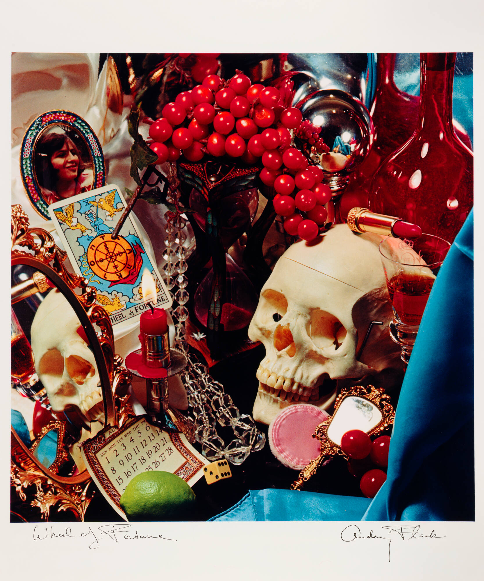 DescriptionStill life image composed of a human skull, lipstick, gold hand mirror, burning candle, tarot card, and bunch of red grapes among other items.Copyright© Audrey Flack