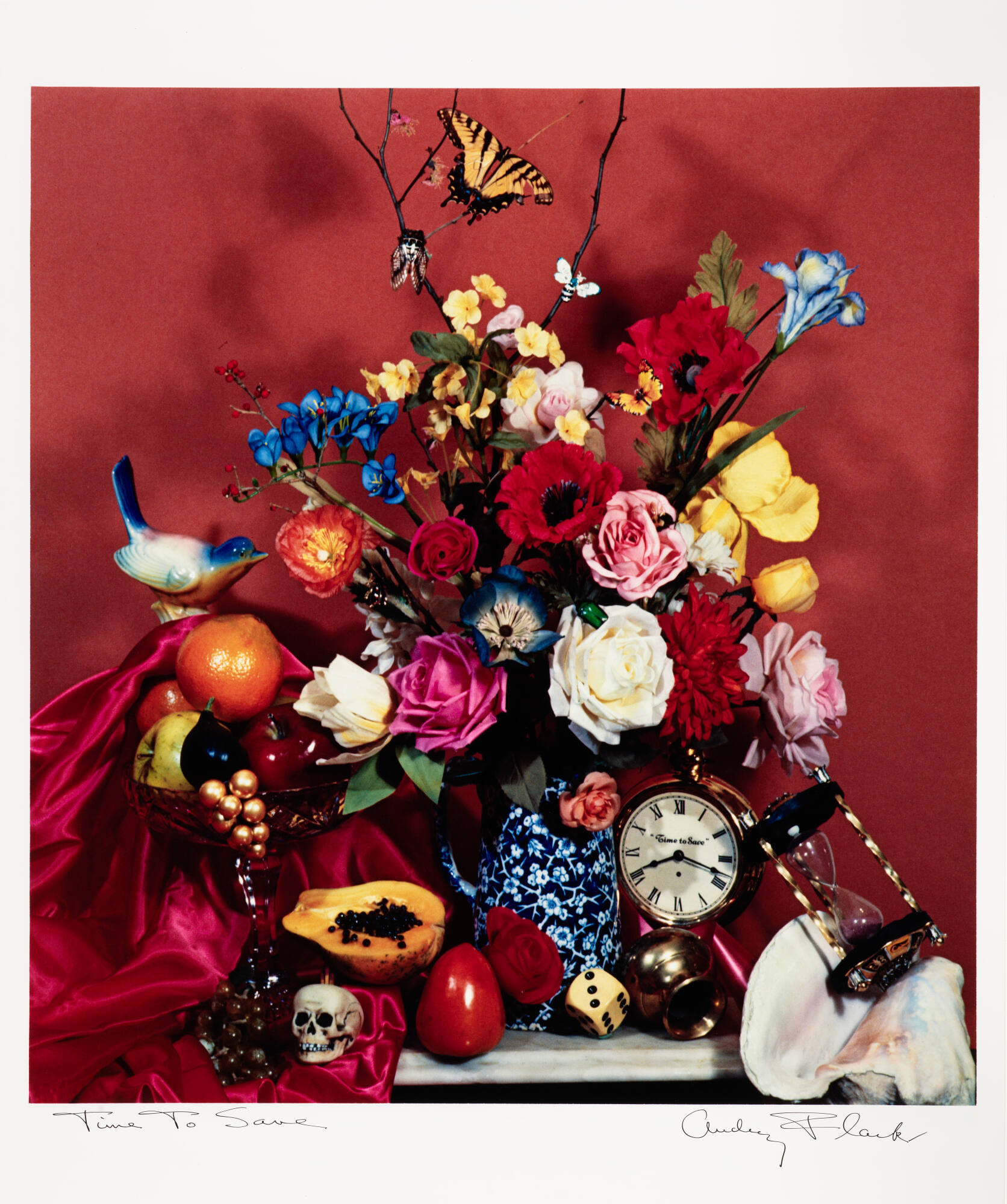 DescriptionImage of a floral still life with a butterfly perched on a branch near the top. A bowl of fruit, tiny human skull, clock, and an hourglass are arranged on the table surrounding the flowers.Copyright© Audrey Flack