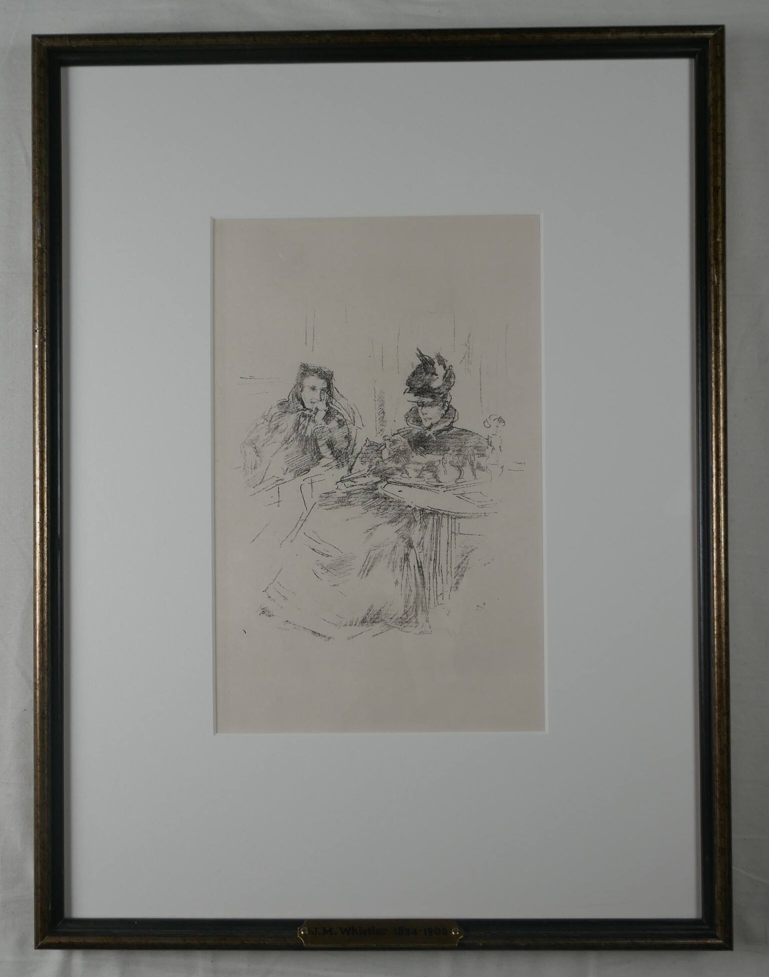 DescriptionThis lithograph is printed in tones of black and gray on cream-colored paper. It depicts two sketchily rendered women who sit in a vaguely described interior space with a small table at the far right laden with a tea service and what appears to be a small bouquet. The woman at the far left of the composition appears older than the woman at the right. She gazes towards her younger companion with her chin resting in her proper left hand. She is dressed in dark attire with a dark head covered tied with a bow under her chin. The woman at the right is similarly dressed in a dark costume with a long, full skirt and a high collar that frames her face and sharp chin. Her hair is swept up under a dark hat that is tipped slightly forward and may be adorned with plumes.ProvenancePurchased from Mission Road Antique Mall, Prairie Village, Kansas, ca. 2015-2017;