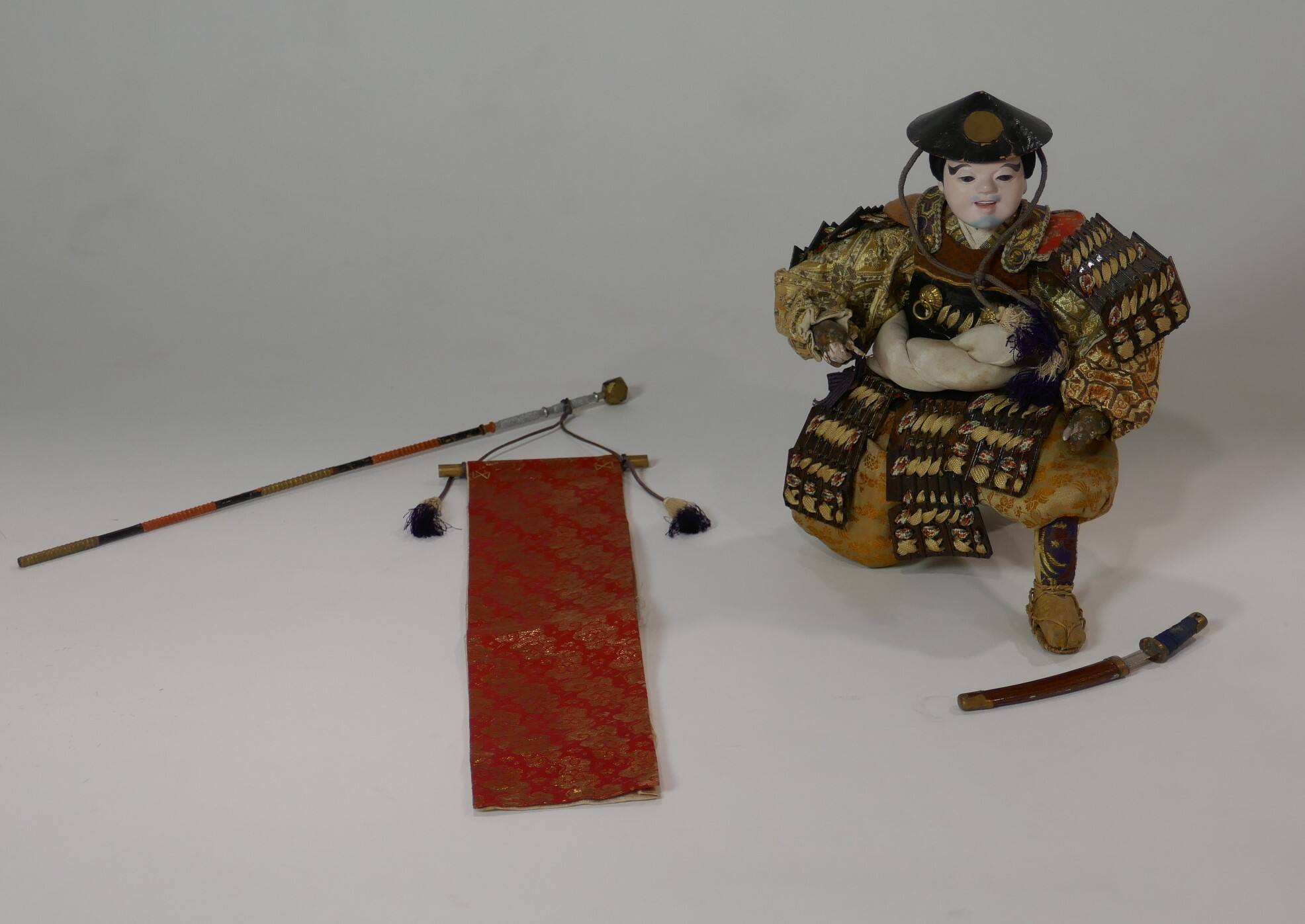 DescriptionThis doll portrays a bannerman holding a banner in his right hand. He wears a flat, lacquered helmet with a circular motif and a pair of brown cords, lacquered paper armor with silk lacing, a thick belt covered with white fabric, and a pair of bulky pants. His clothes are made of silk, and he wears a pair of straw sandals. His face is round and painted with pigmented gofun, and his teeth show as he smiles. The red silk brocade banner is attached to a long pole with a fitting at the top.