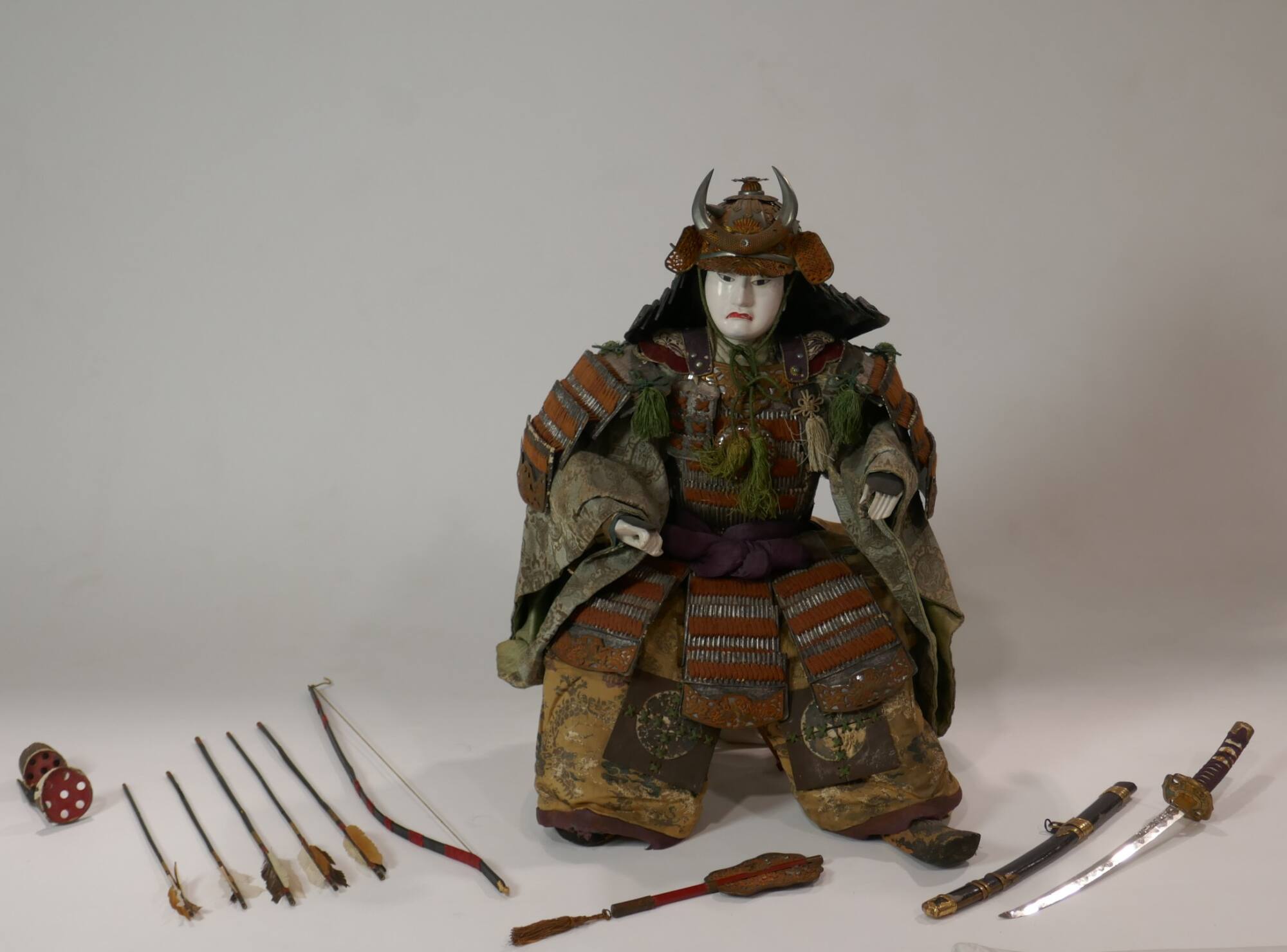 DescriptionThis doll portrays a seated high-ranking warrior with an elaborate helmet and suit of armor. He is seated on a stool, and he holds a batton with ornaments depicting the sun, the moon, a lion, Big Dipper, a star, and a Buddhist jewel placed on a three-legged stand. His face is oval, and his hair is tied on the back. The helmet has horn-like decorations and a crescent-shaped finial on the front. He holds a sword with a white hilt and black-lacquered sheath decorated with makie and gold elements. He has a bow, three tall arrows, two short arrows, and a quiver. His armor is made of paper plates coated with silver leaf and joined by orange laces. The breastplate has a roundel with a dragon motif. His robe is made of light blue silk with silver thread, and his trousers are made of ochre silk brocaded with silver thread and silk. His belt is wrapped with plain purple silk. The armor plates are decorated with metal finials showing lions.