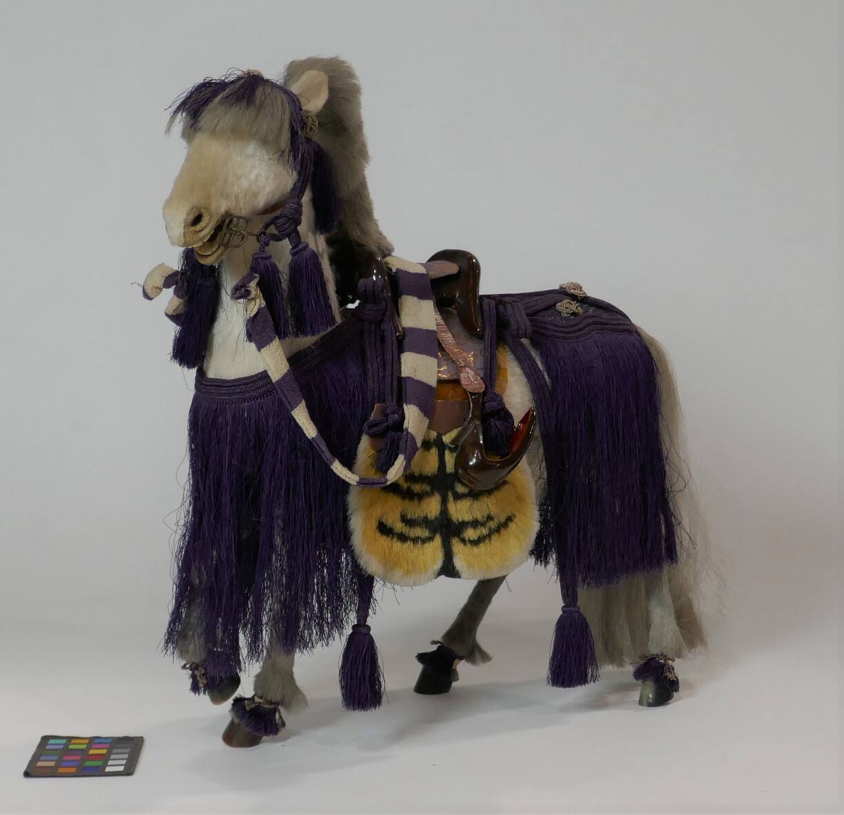 DescriptionThis doll portrays a kazariuma, or ceremonial horse. The horse is executed in the keuesaiku, or hair-planting, a technique to make the fur covering the body realistically. Its eyes are inlaid glass, and its mouth is open with teeth showing. The horse is adorned with purple trapping, striped silk crepe reigns, lacquered saddles with faux tiger belt side flaps, and long silk tassel ornamentation. Its mane is drawn in a series of cuffed braids.