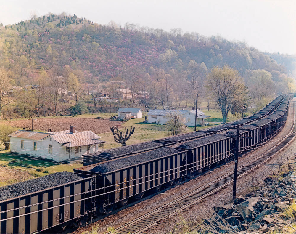 DescriptionImage of rail cars filled with coal winding to the right and disappearing. On the left are homes scattered among the hillside with evergreens and purple-hued trees.ProvenanceJoel Sternfeld, New York;