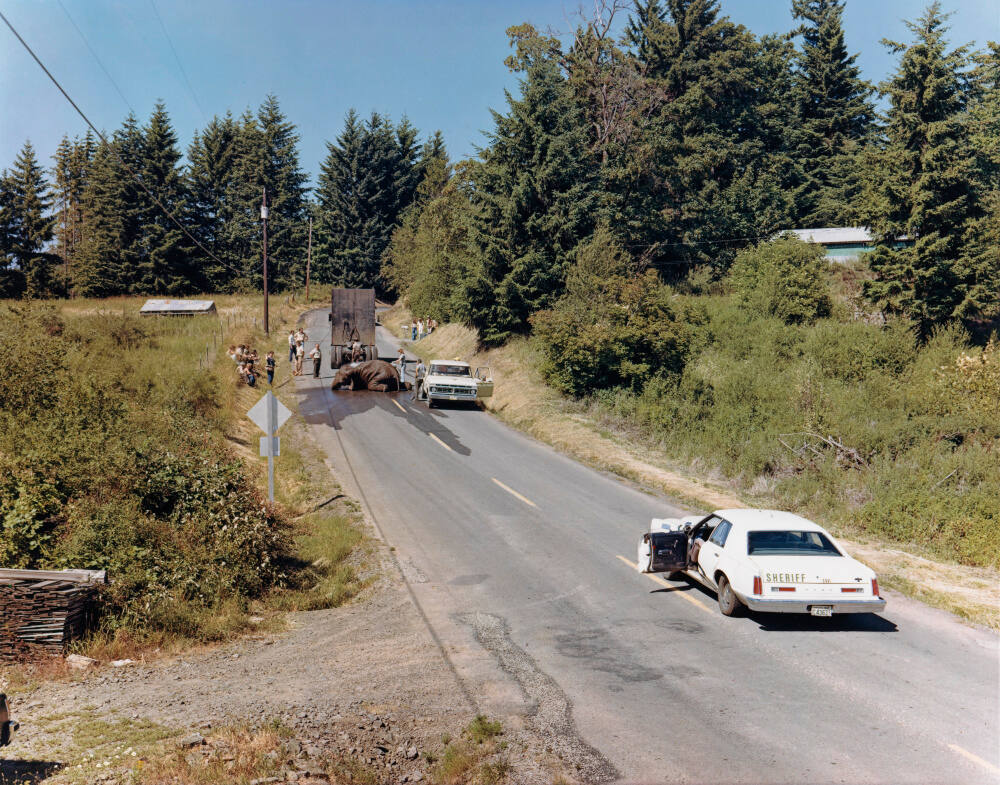 DescriptionImage of an elephant lying in the middle of a road with a group of onlookers and a Sheriff gathered nearby. A woman attempts to cool the elephant by spraying him down with water.ProvenanceJoel Sternfeld, New York;