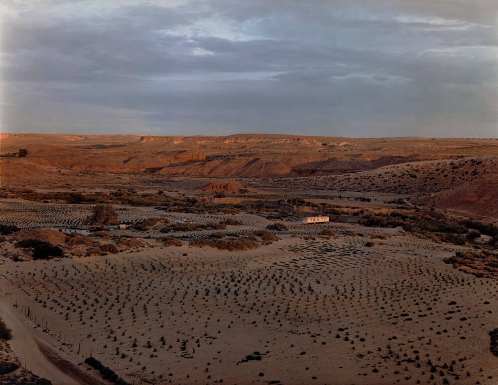 DescriptionImage of an arid landscape with low lying mountains, tufts of grass, and a trailer home near the center. Narrow bands of clouds fill the sky and cast a shadow over the foreground.ProvenanceJoel Sternfeld, New York;