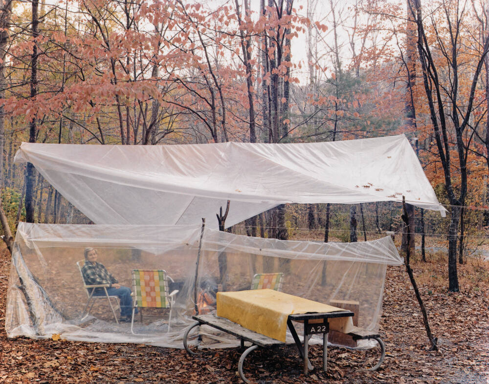 DescriptionImage of a person wearing a plaid shirt and jeans seated in a lawn chair under a makeshift tarp next to a picnic table. The setting is a forested area with fallen leaves covering the ground.ProvenanceJoel Sternfeld, New York;