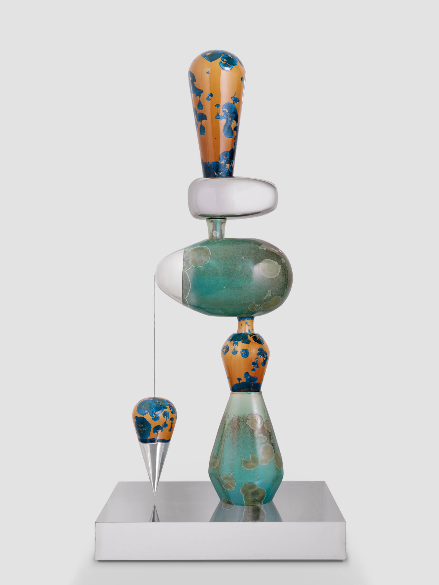 Li used crystalline glazing in his multimedia installation Allegory of Balance #18. This type of ceramic glazing process includes zinc oxide, which helps develop vibrant patterns during the cooling stages of a kiln firing. After producing the ceramic pieces, Li incorporated polished steel to reflect the glowing glaze designs.