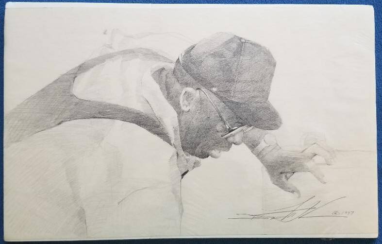 DescriptionThis small, horizontally oriented graphite on paper drawing shows an African American man from the waist up in profile who leans forward (facing the right-hand side of the sheet) and supports himself on his proper left hand on an unidentified rectangular object at the lower right corner of the image. The man appears middle-aged He wears a light-colored shirt and dark overalls. He also wears a dark ball cap, glasses, and a wristwatch on his proper left hand.ProvenanceThe artist;
