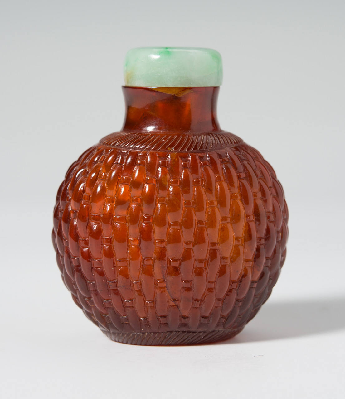 DescriptionSmall flattened moon-shaped bottle carved overall with a basket design, Fei Ts'ui jade stopper.