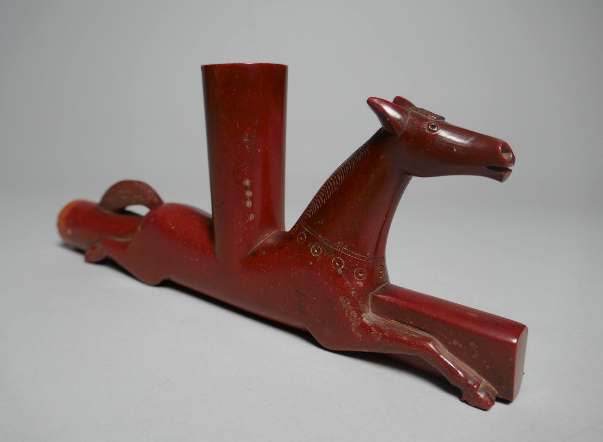 DescriptionRed stone pipe in the form of a galloping horse with slightly flared bowl emerging from its back, finely modeled and with incised detail, deep, rich patina from use.ProvenanceEx-collection Denmark;