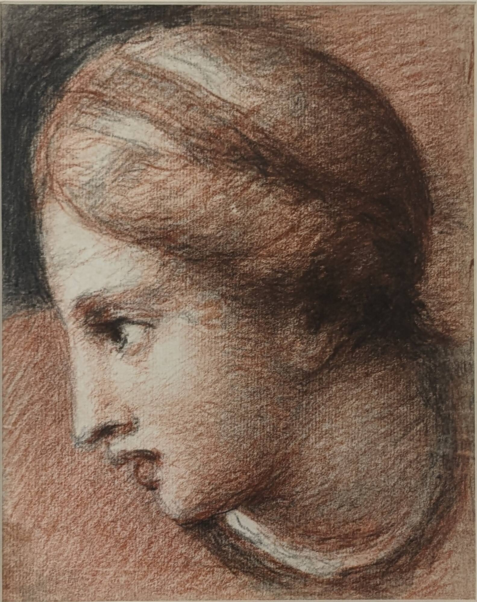 DescriptionBlack and red chalk drawing of a female figure in profile, facing to her right. She has a long, straight nose, slightly parted lips, and her hair is done up with a headband.Exhibition History