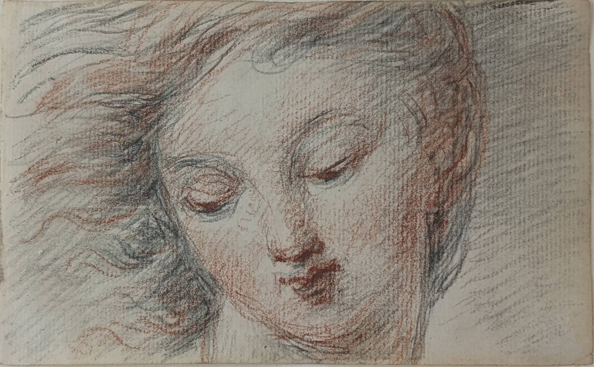 DescriptionBlack and red chalk drawing of the head of a female figure, looking down and to her right. Her hair blows in the wind to her right.Exhibition HistoryArt Treasures of the United Kingdom, Manchester, UK, May 5–October 17, 1857.