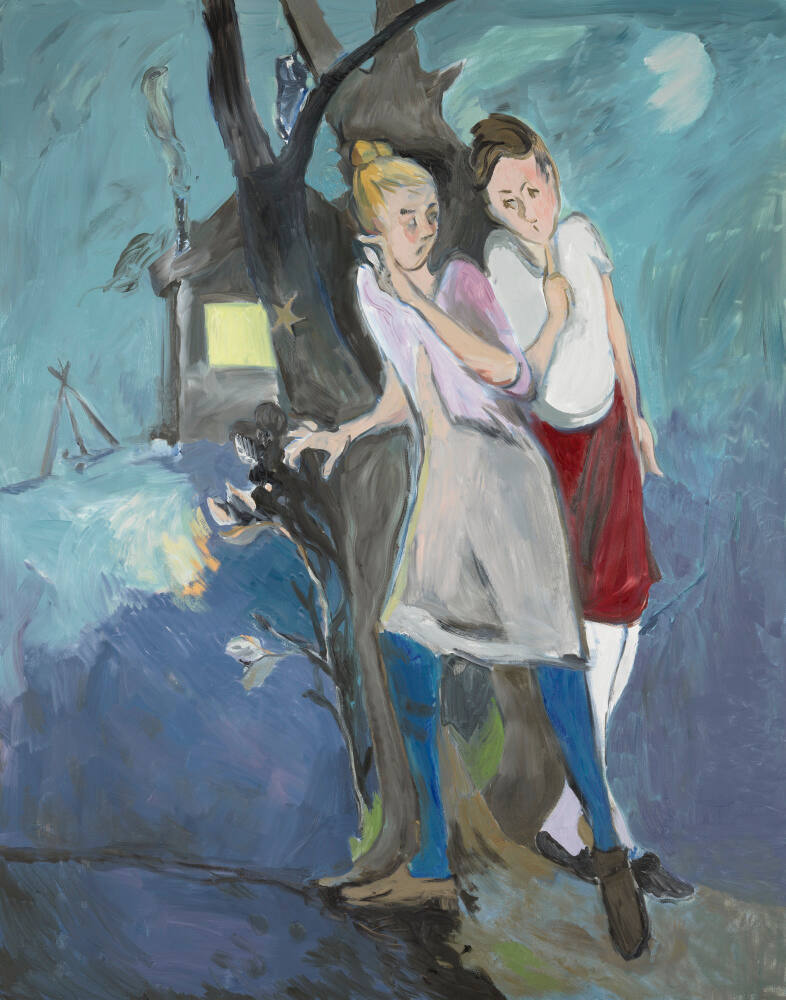 DescriptionTwo female figures painted in a hazy, cartoonish style hiding behind a tree seemingly spying or speaking quietly to each other.ProvenanceThe artist;