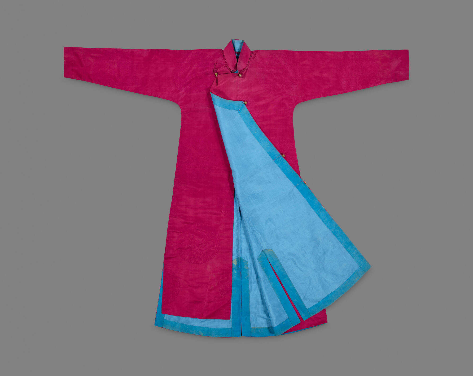 DescriptionFuchsia colored silk robe in the early 20th century changpao (full-length robe) style. It has a high stand-up collar, and side flap fastened with five pairs of silk loops and metal buttons. The bright fuchsia silk fabric is woven with large roundel patterns of dragon image. The garment is lined with blue silk in plain weave.ProvenanceWith Laurence Sickman (1898-1989), about 1930s-1973;