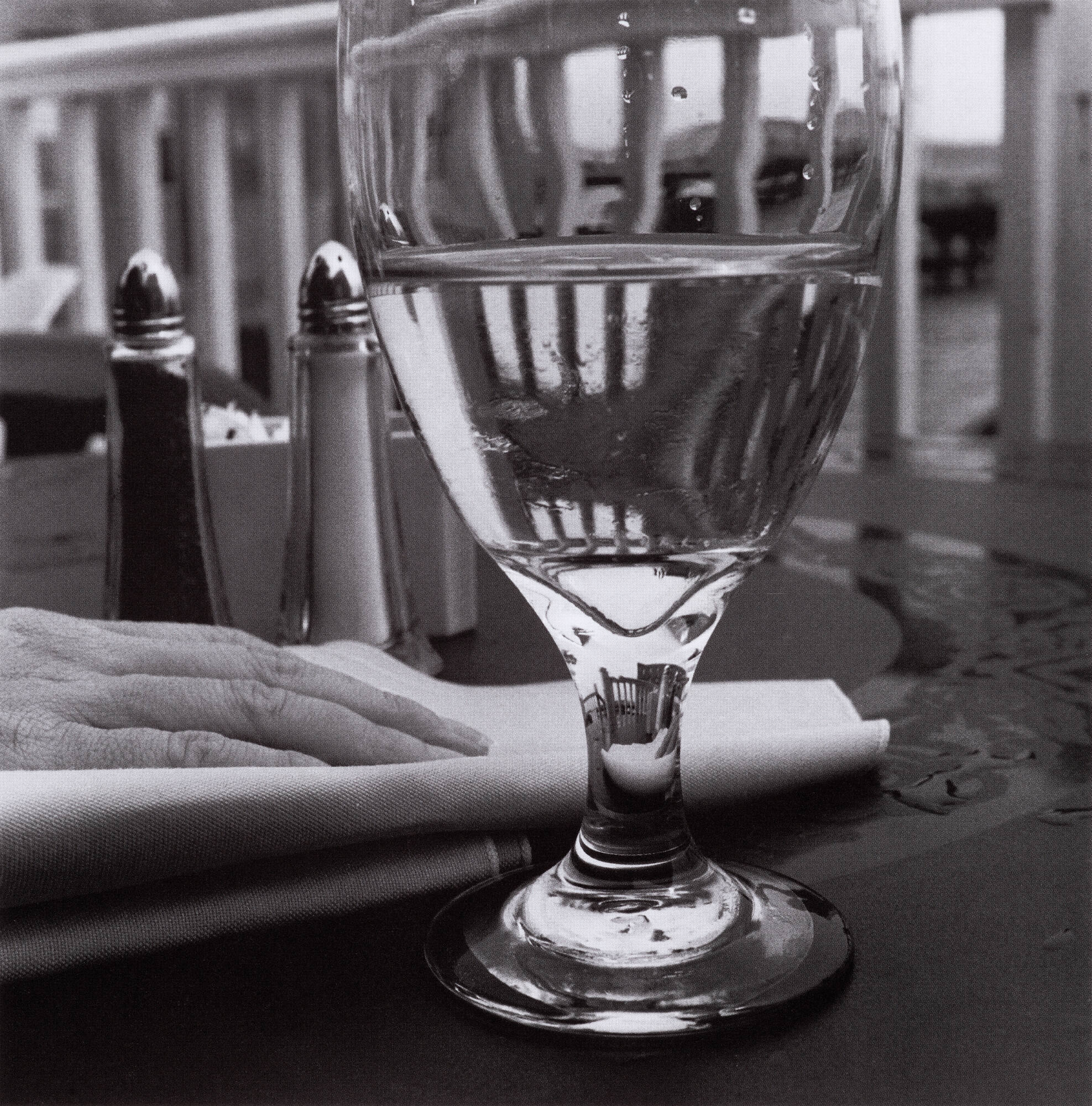 DescriptionImage of a glass goblet that is half full of water. A hand rests on a fabric napkin beside salt and pepper shakers.ProvenanceLouis Stettner;