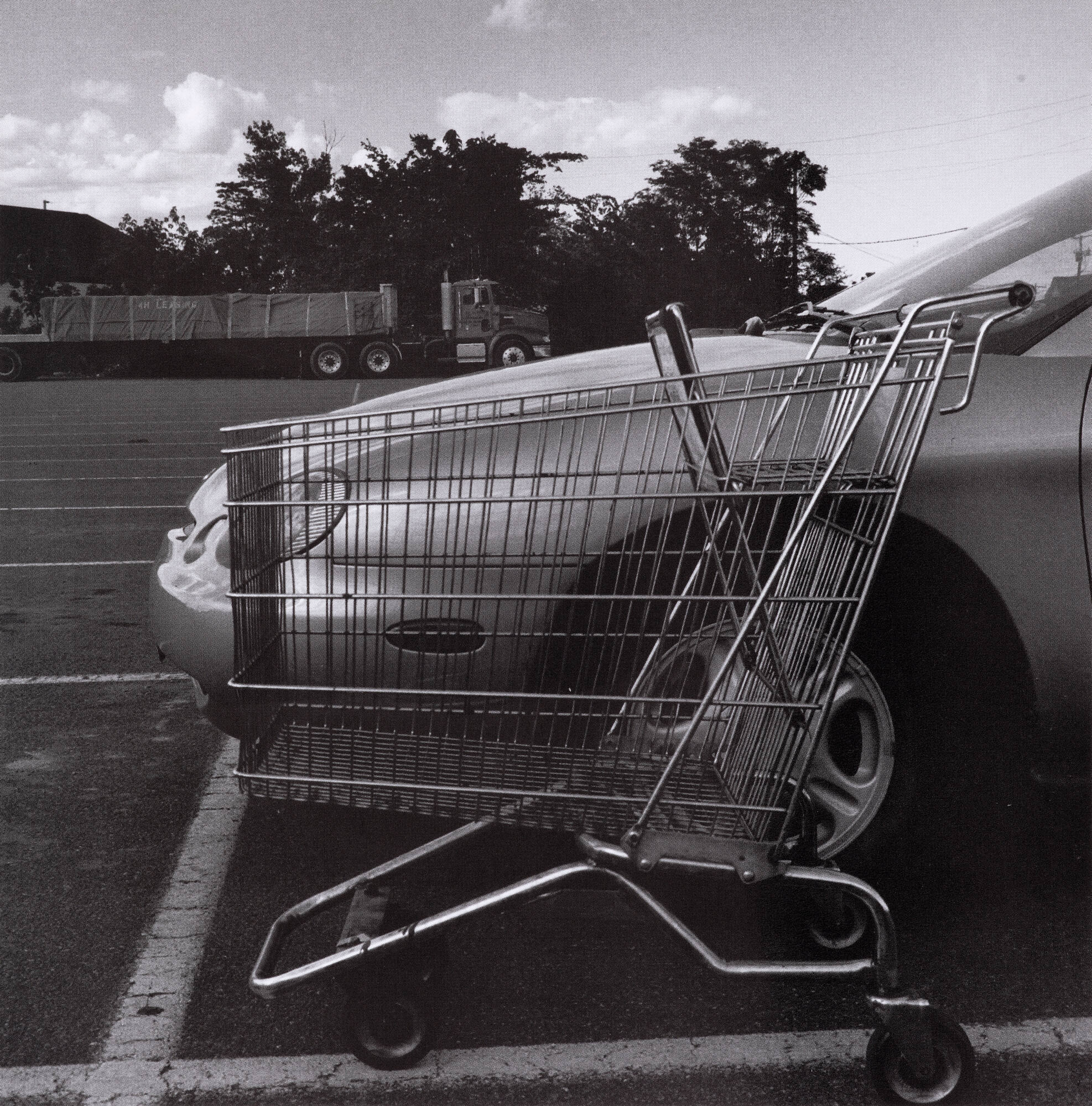 DescriptionImage of an empty grocery cart next to a parked car. In the background is a semitruck parked next to a row of trees against a sky with scattered clouds.ProvenanceLouis Stettner;
