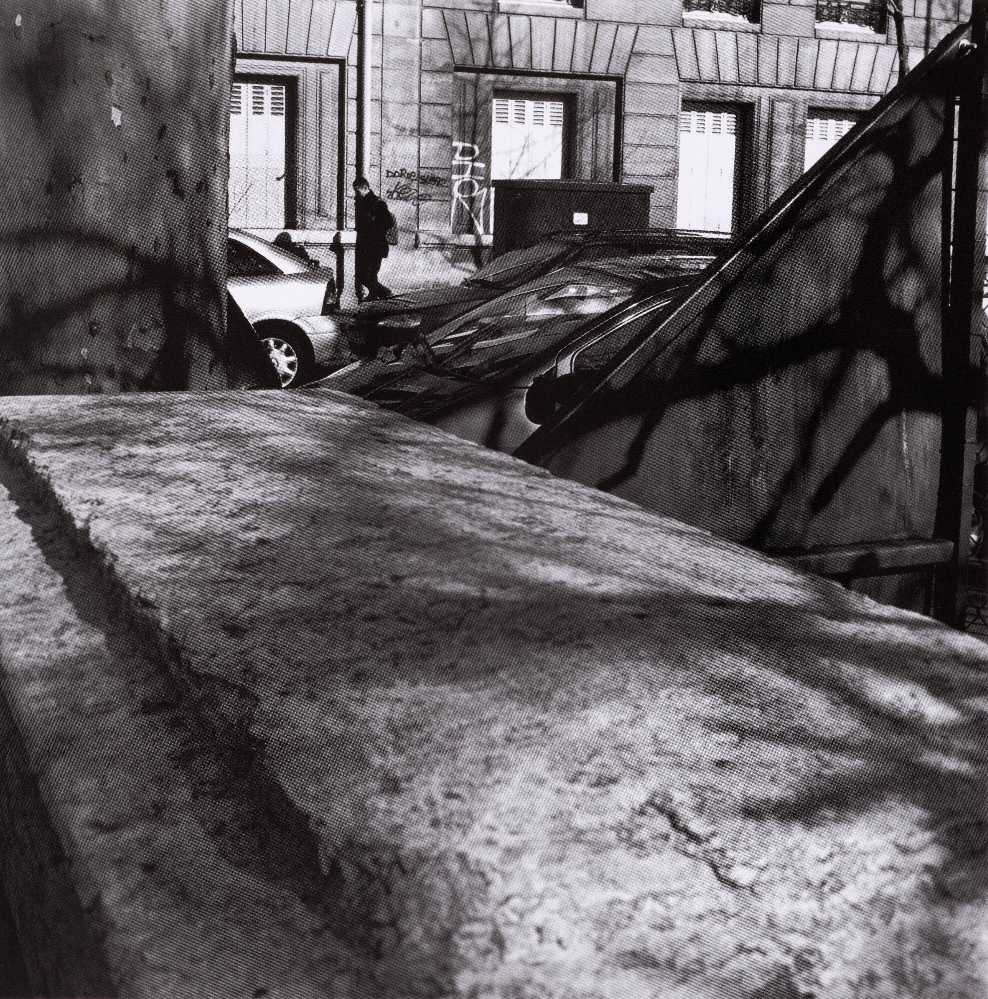 DescriptionImage of a man walking on the sidewalk next to parked cars. The foreground is obscured with a concrete slab and diagonal metal structure.ProvenanceLouis Stettner;