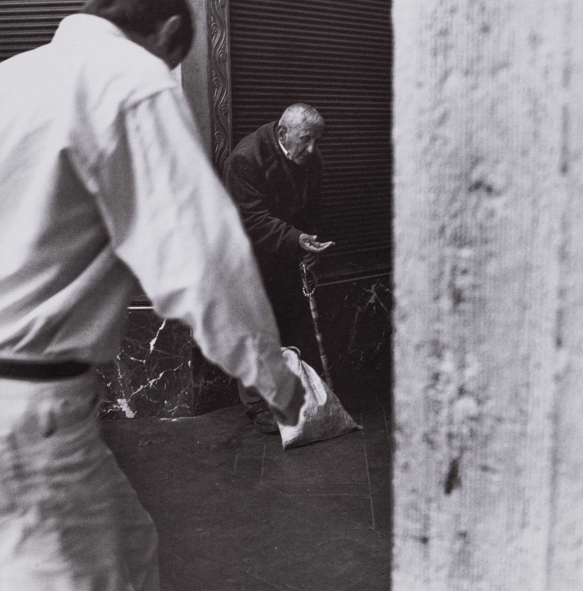 DescriptionImage of a man, leaning against a wall, holding a cane with one hand outstretched. Another man, partially cropped from view appears along the left edge of the frame.ProvenanceLouis Stettner;