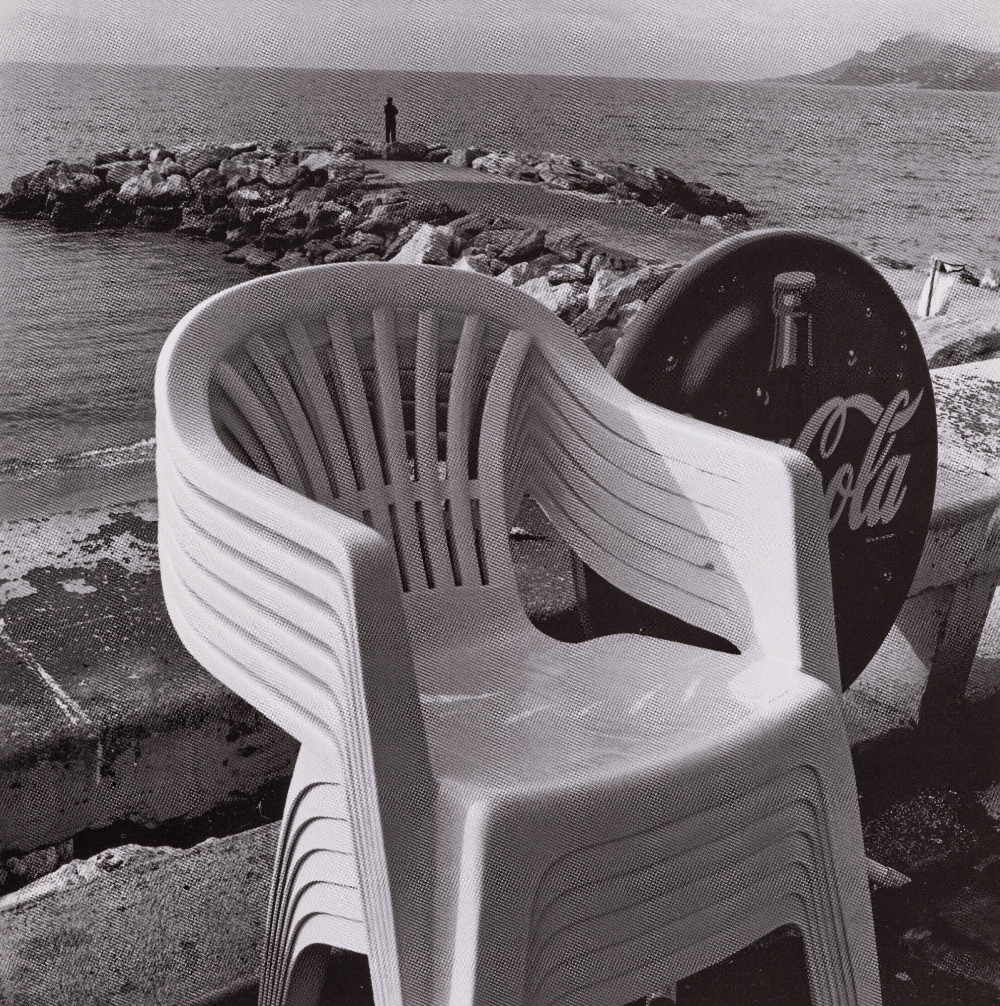 DescriptionImage of plastic chairs stacked against a stone wall overlooking a body of water. A figure stands in the distance near the top of the frame.ProvenanceLouis Stettner;